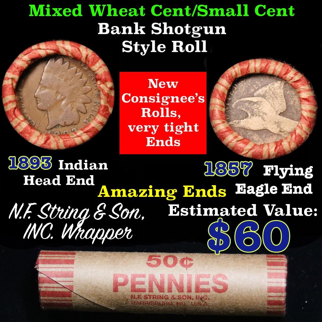 Mixed small cents 1c orig shotgun roll, 1857 Flying Eagle, 1893 Indian Cent other end. The roll is held in an old Seal Strong wrapper. Actual roll pictured is the roll you will get. A great original bank shotgun roll with very tight ends. We have been getting excellent feedback on these rolls. Were being told that close to half the roll are teens, some with mintmarks, there are a few Indians in all the rolls, most of the rolls have steel cents. They seem to be PQ Wheaties rolls. These shotgun rolls are all from a new consignee. They are all frrom one Estate.