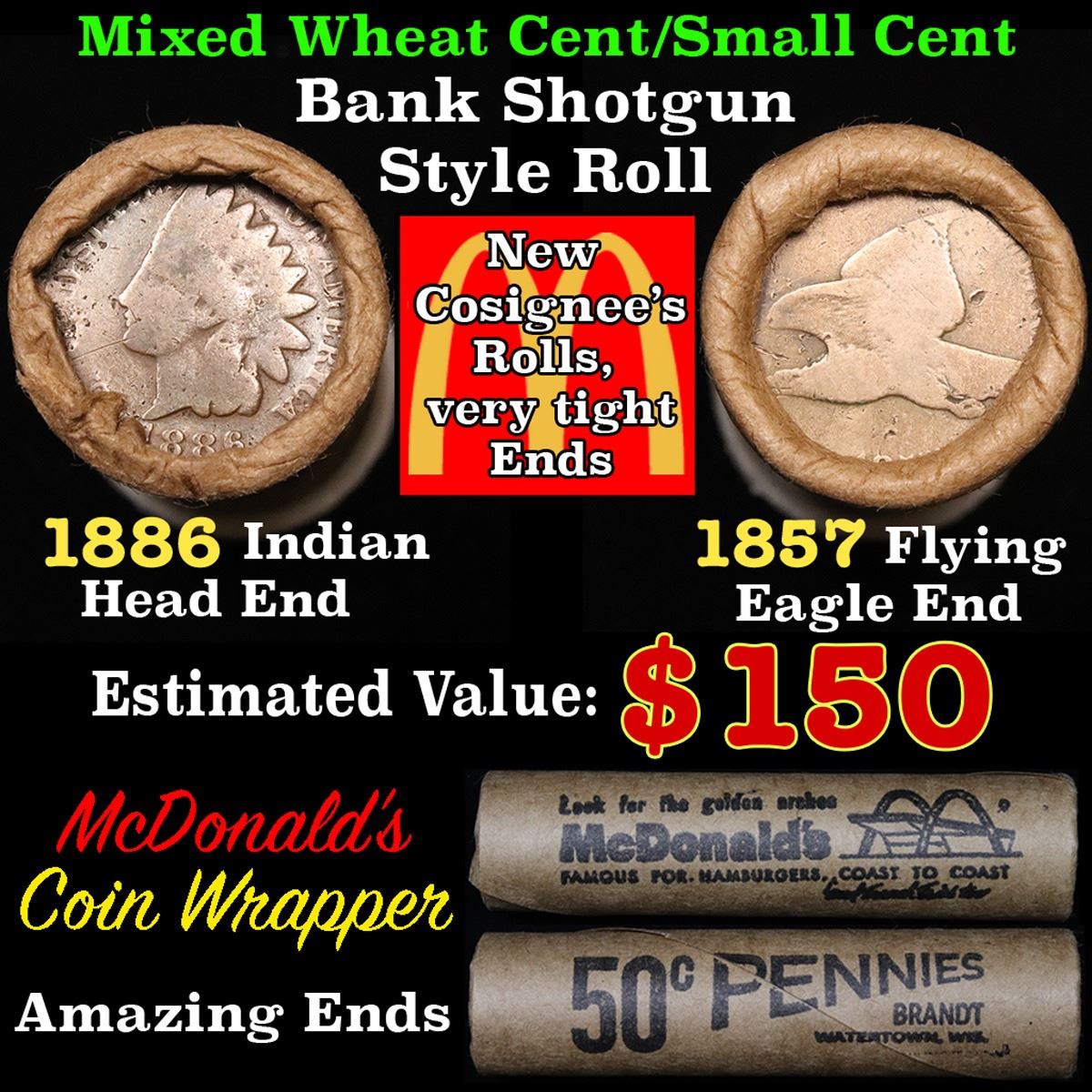 Mixed small cents 1c orig shotgun roll, 1857 Flying Eagle Cent, 1886 Indian Cent other end.        The roll is held in an old Rare & Collectable McDonalds Brandt wrapper. Actual roll pictured is the roll you will get. A great original bank shotgun roll with very tight ends. We have opened a few of these rolls. They seem to be mixed small cents including Indians, Wheats, Steel cents & some Flying Eagles mixed in. These shotgun rolls are all from a new consignee. They are all frrom one Estate.