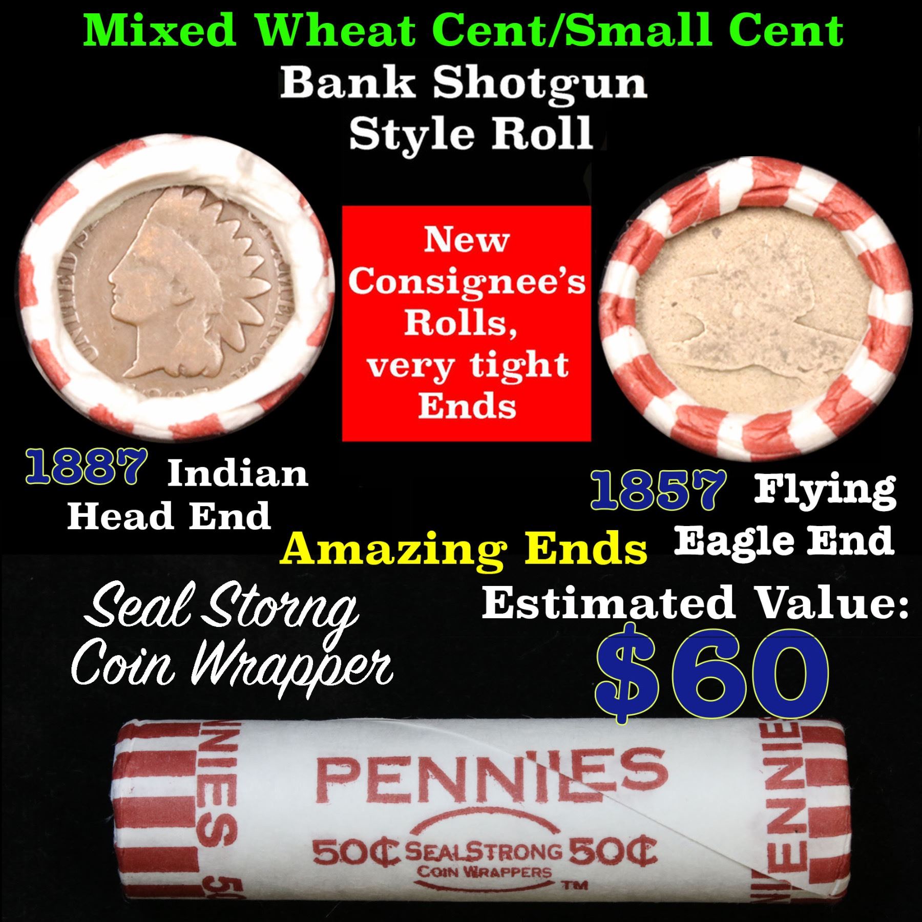 Mixed small cents 1c orig shotgun roll, 1857 Flying Eagle Cent, 1887 Indian Cent other end. The roll is held in an old Seal Strong wrapper. Actual roll pictured is the roll you will get. A great original bank shotgun roll with very tight ends. We have been getting excellent feedback on these rolls. Were being told that close to half the roll are teens, some with mintmarks, there are a few Indians in all the rolls, most of the rolls have steel cents. They seem to be PQ Wheaties rolls. These shotgun rolls are all from a new consignee. They are all frrom one Estate.