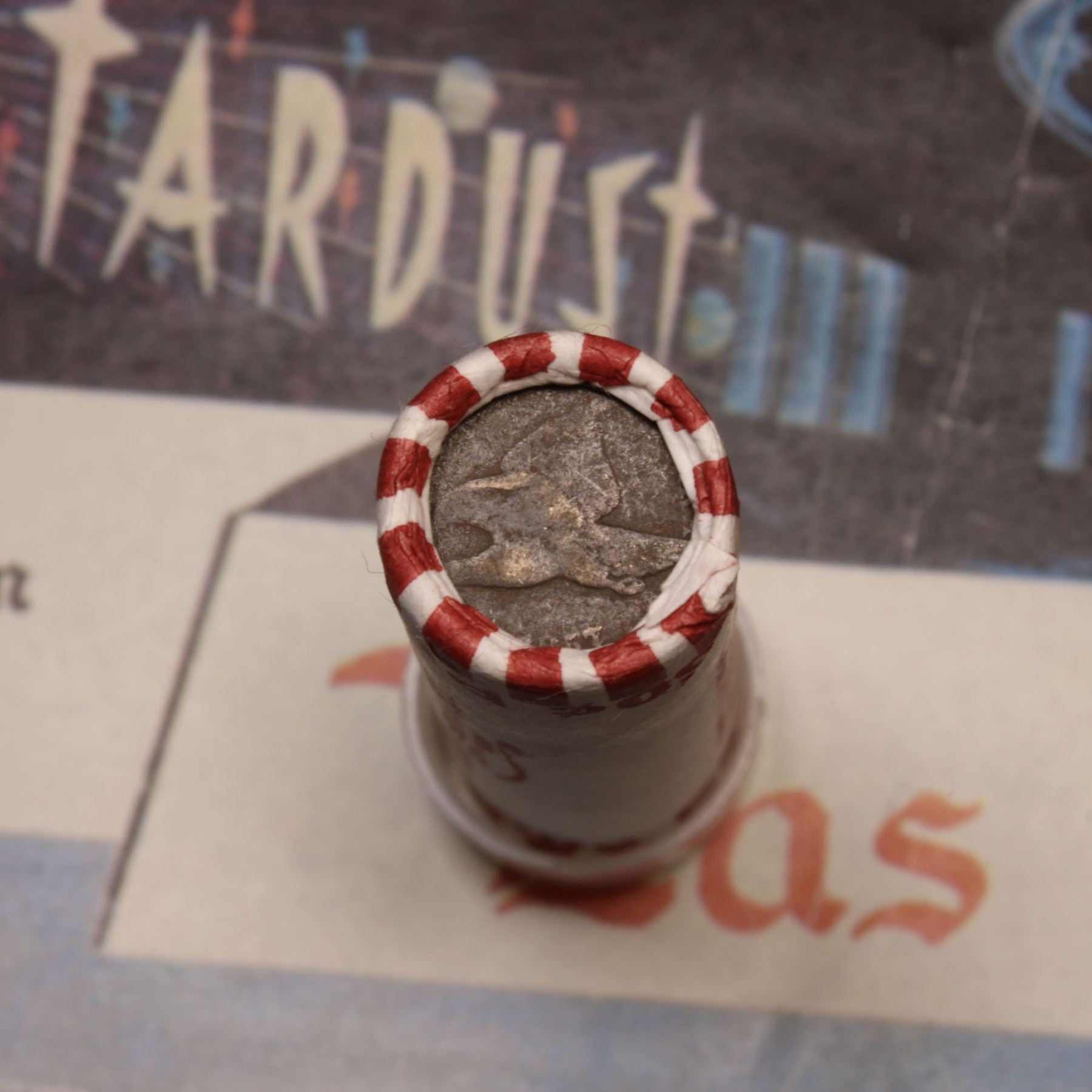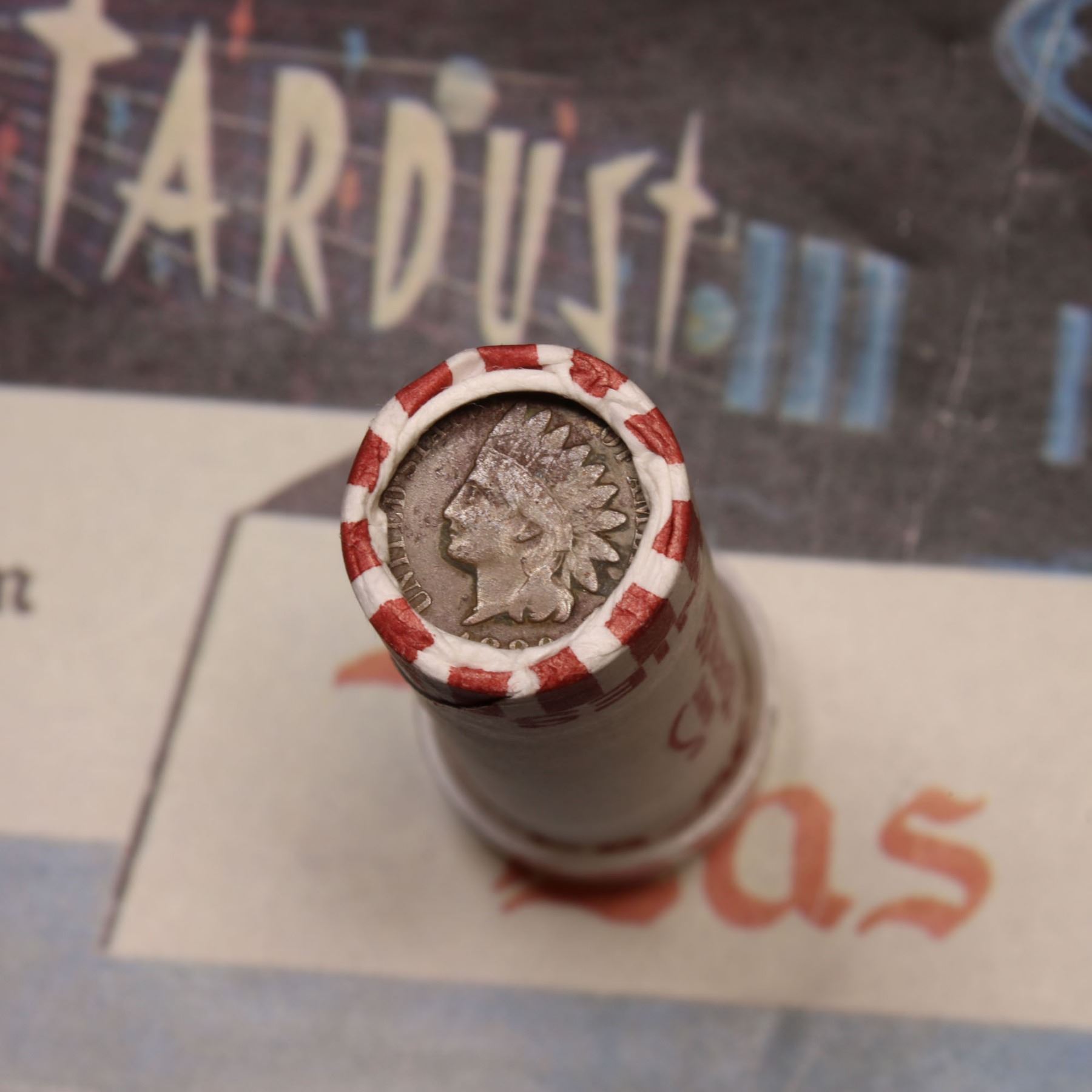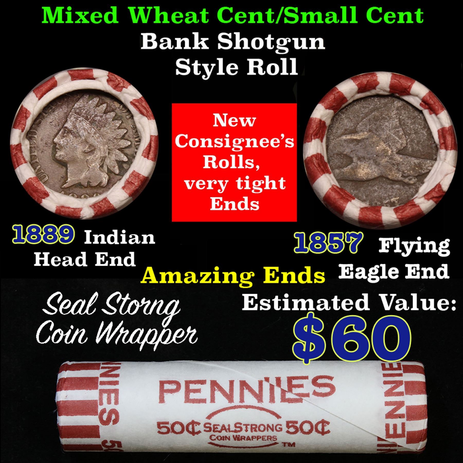 Mixed small cents 1c orig shotgun roll, 1857 Flying Eagle Cent, 1889 Indian Cent other end. The roll is held in an old Seal Strong wrapper. Actual roll pictured is the roll you will get. A great original bank shotgun roll with very tight ends. We have been getting excellent feedback on these rolls. Were being told that close to half the roll are teens, some with mintmarks, there are a few Indians in all the rolls, most of the rolls have steel cents. They seem to be PQ Wheaties rolls. These shotgun rolls are all from a new consignee. They are all frrom one Estate.
