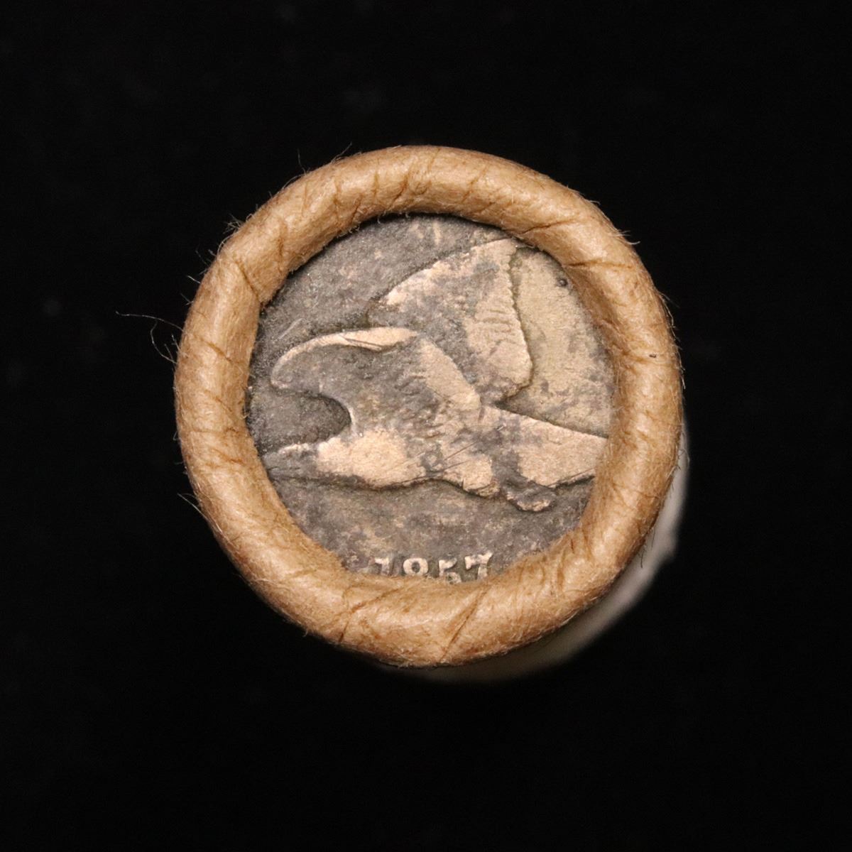 Mixed small cents 1c orig shotgun roll, 1857 Flying Eagle Cent, 1889 Indian Cent other end