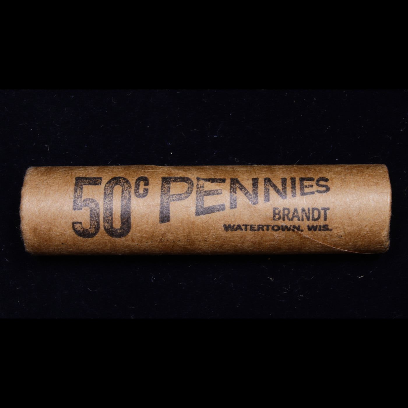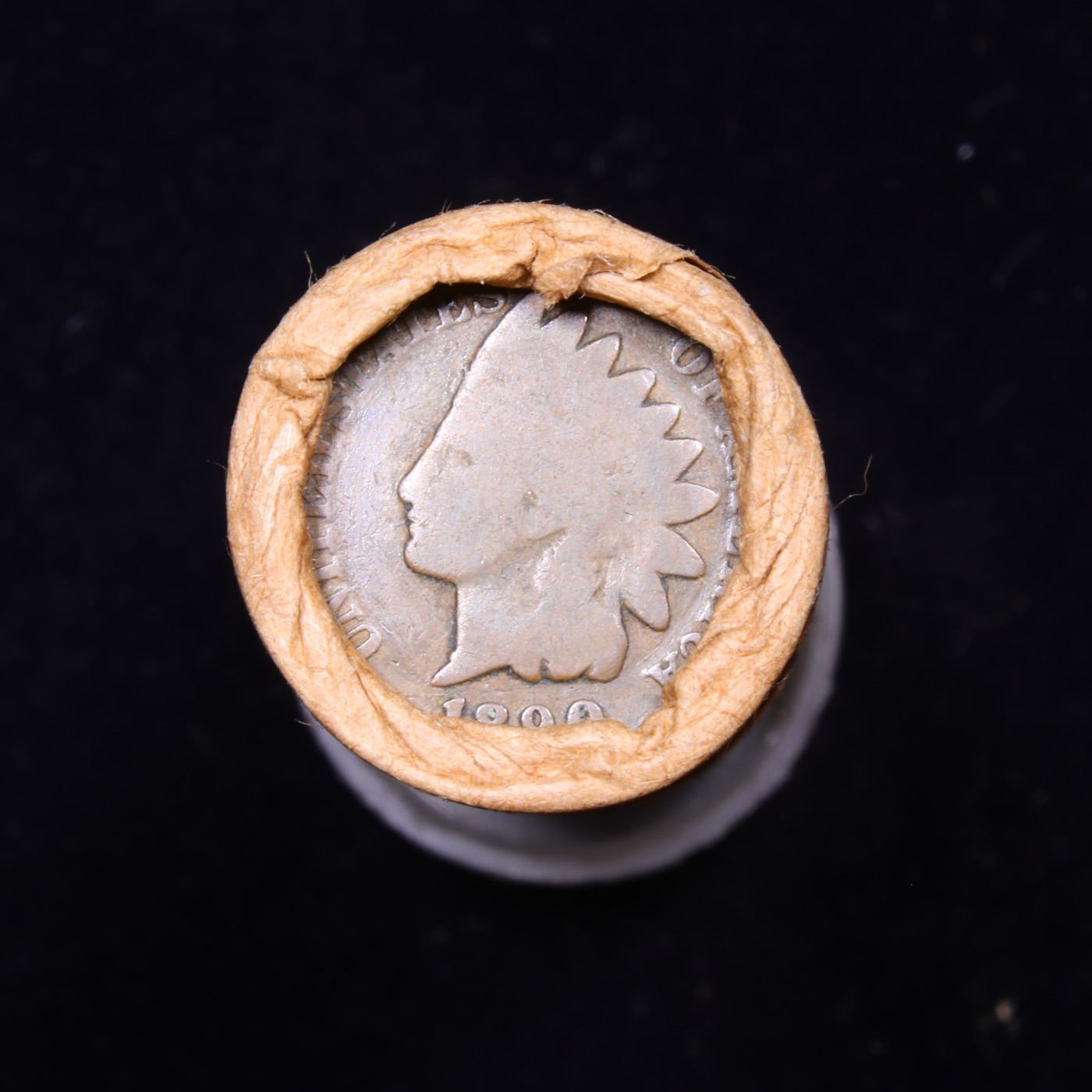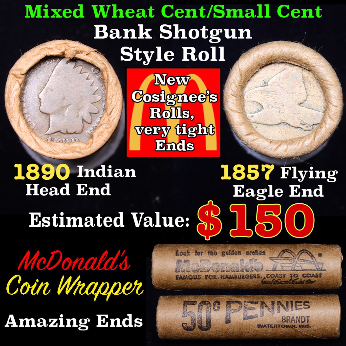 Mixed small cents 1c orig shotgun roll, 1857 Flying Eagle Cent, 1890 Indian cent other end, McDonald