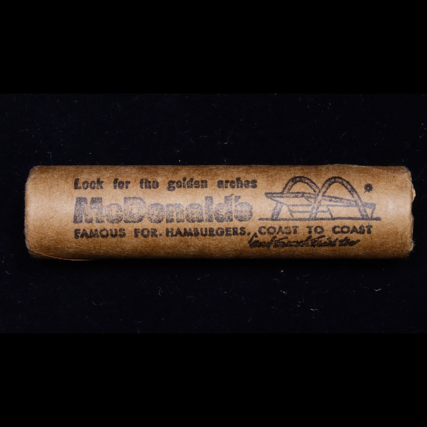 Mixed small cents 1c orig shotgun roll, 1857 Flying Eagle Cent, 1890 Indian cent other end, McDonalds Wrapper Grades. The roll is held in an old Rare & Collectable McDonalds Wrapper. Look for the Golden Arches. Actual roll pictured is the roll you will get. A great original bank shotgun roll with very tight ends. We have opened a few of these rolls. They seem to be mixed small cents including Indians, Wheats, Steel cents & some Flying Eagles mixed in. These shotgun rolls are all from a new consignee. They are all frrom one Estate.