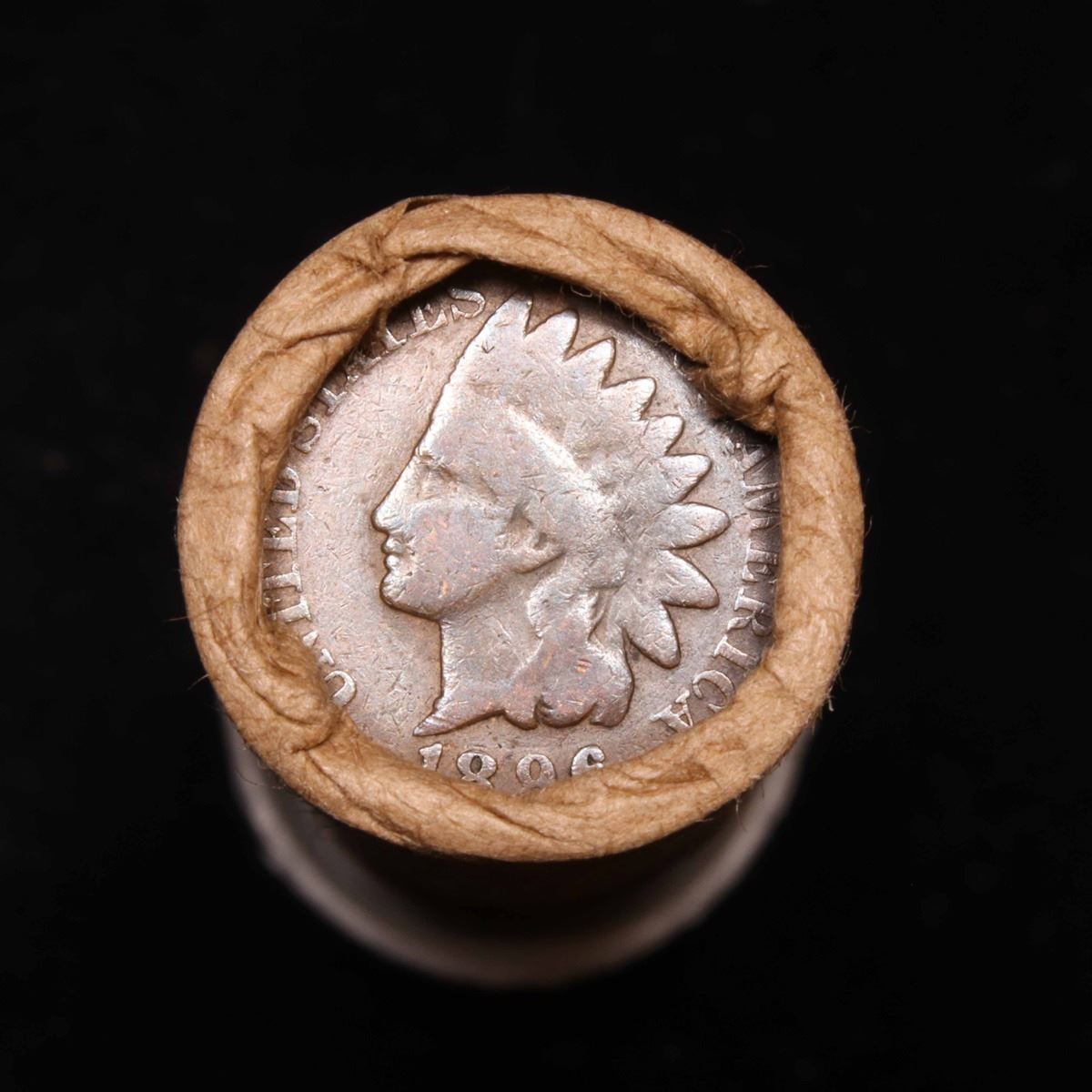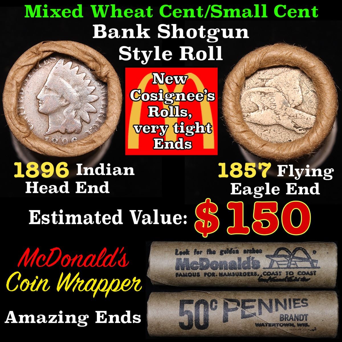 Mixed small cents 1c orig shotgun roll, 1857 Flying Eagle Cent, 1896 Indian Cent other end, McDonald