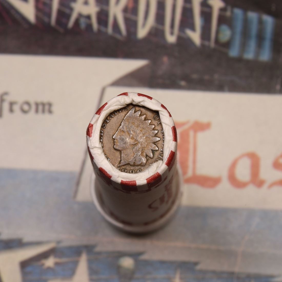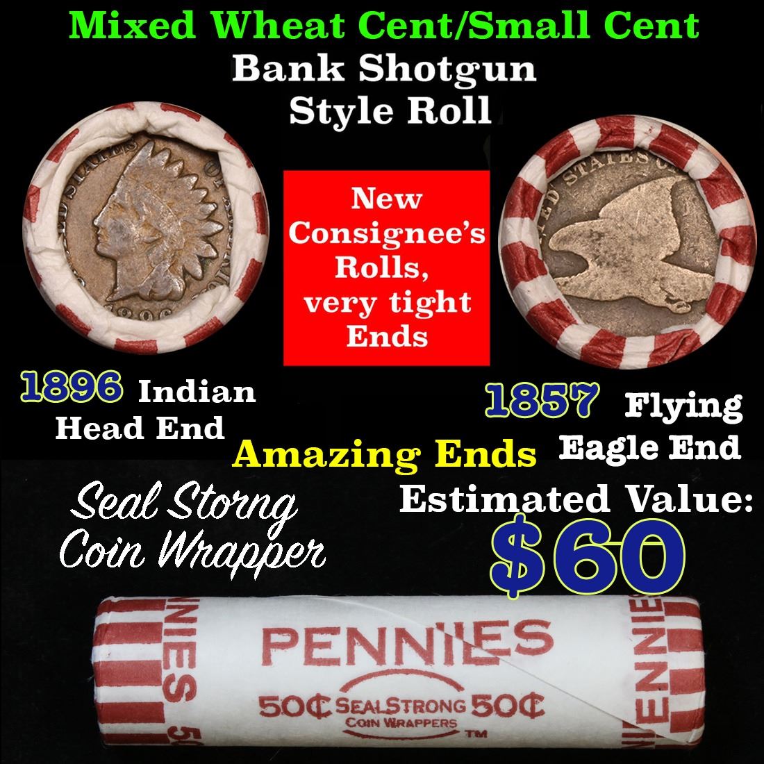 Mixed small cents 1c orig shotgun roll, 1857 Flying Eagle Cent, 1896 Indian Cent other end. The roll is held in an old Seal Strong wrapper. Actual roll pictured is the roll you will get. A great original bank shotgun roll with very tight ends. We have been getting excellent feedback on these rolls. Were being told that close to half the roll are teens, some with mintmarks, there are a few Indians in all the rolls, most of the rolls have steel cents. They seem to be PQ Wheaties rolls. These shotgun rolls are all from a new consignee. They are all frrom one Estate.
