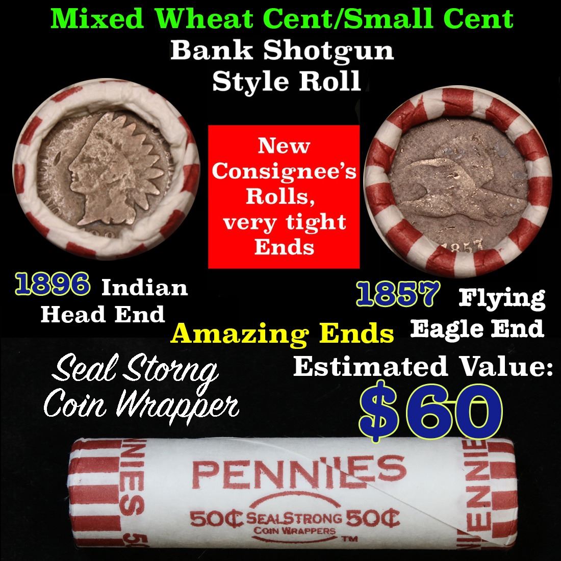 Mixed small cents 1c orig shotgun roll, 1857 Flying Eagle Cent, 1896 Indian Cent other end. The roll is held in an old Seal Strong wrapper. Actual roll pictured is the roll you will get. A great original bank shotgun roll with very tight ends. We have been getting excellent feedback on these rolls. Were being told that close to half the roll are teens, some with mintmarks, there are a few Indians in all the rolls, most of the rolls have steel cents. They seem to be PQ Wheaties rolls. These shotgun rolls are all from a new consignee. They are all frrom one Estate.