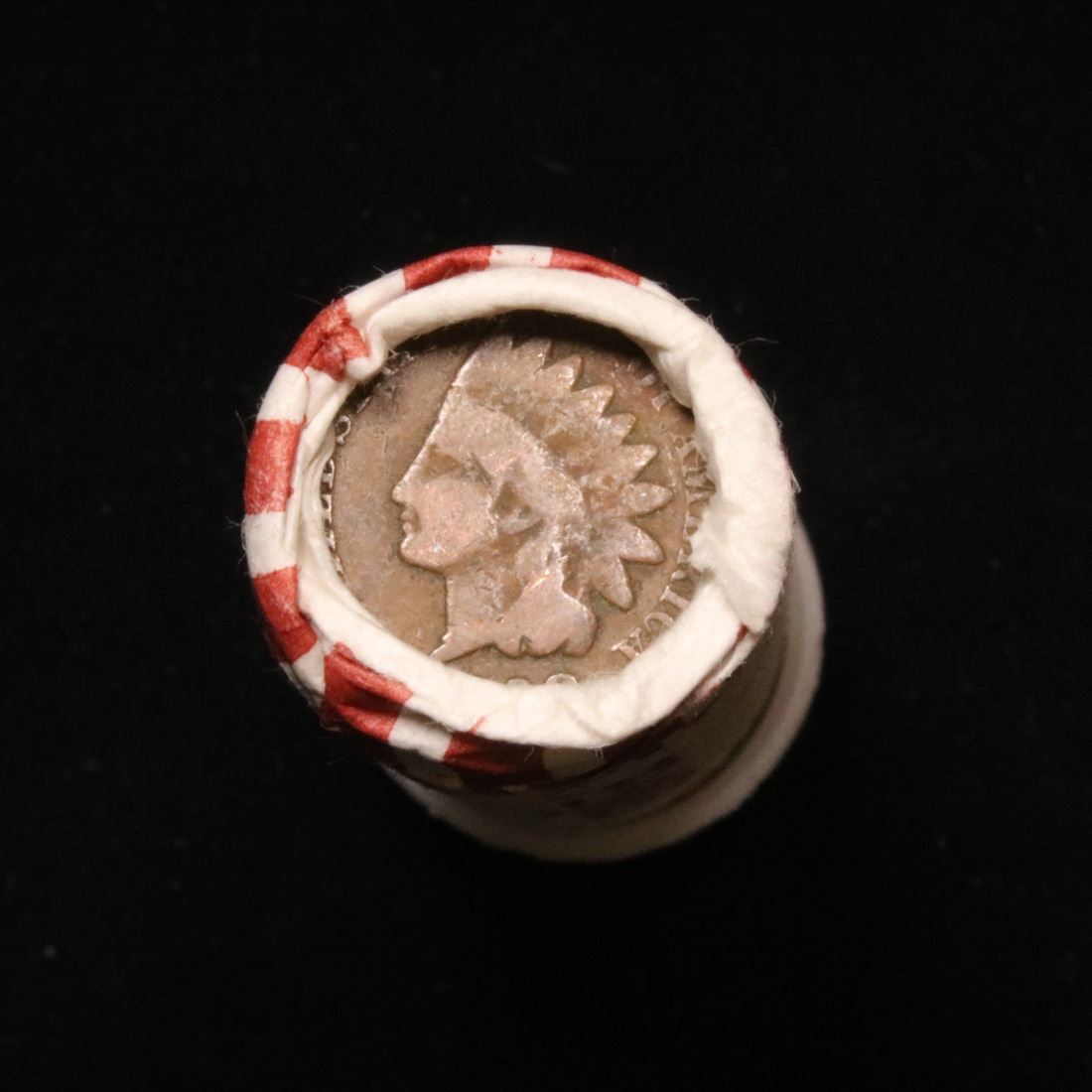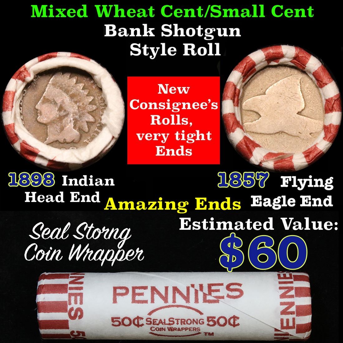 Mixed small cents 1c orig shotgun roll, 1857 Flying Eagle Cent, 1898 Indian Cent other end. The roll is held in an old Seal Strong wrapper. Actual roll pictured is the roll you will get. A great original bank shotgun roll with very tight ends. We have been getting excellent feedback on these rolls. Were being told that close to half the roll are teens, some with mintmarks, there are a few Indians in all the rolls, most of the rolls have steel cents. They seem to be PQ Wheaties rolls. These shotgun rolls are all from a new consignee. They are all frrom one Estate.