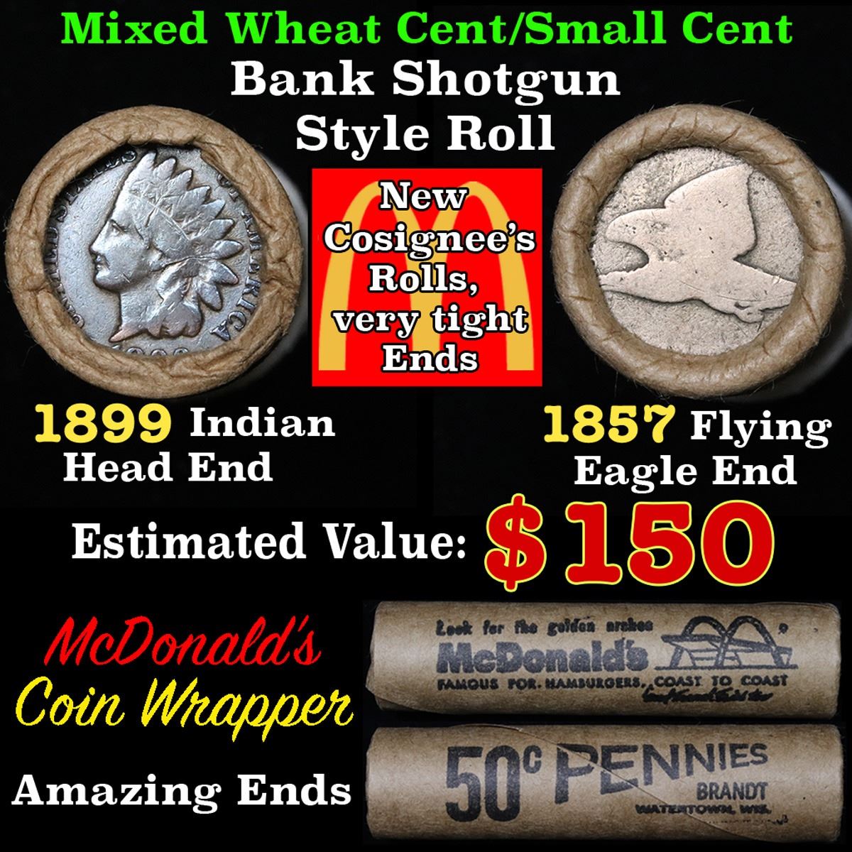 Mixed small cents 1c orig shotgun roll, 1857 Flying Eagle Cent, 1899 Indian Cent other end. The roll is held in an old Rare & Collectable McDonalds Brandt wrapper. Actual roll pictured is the roll you will get. A great original bank shotgun roll with very tight ends. We have opened a few of these rolls. They seem to be mixed small cents including Indians, Wheats, Steel cents & some Flying Eagles mixed in. These shotgun rolls are all from a new consignee. They are all frrom one Estate.