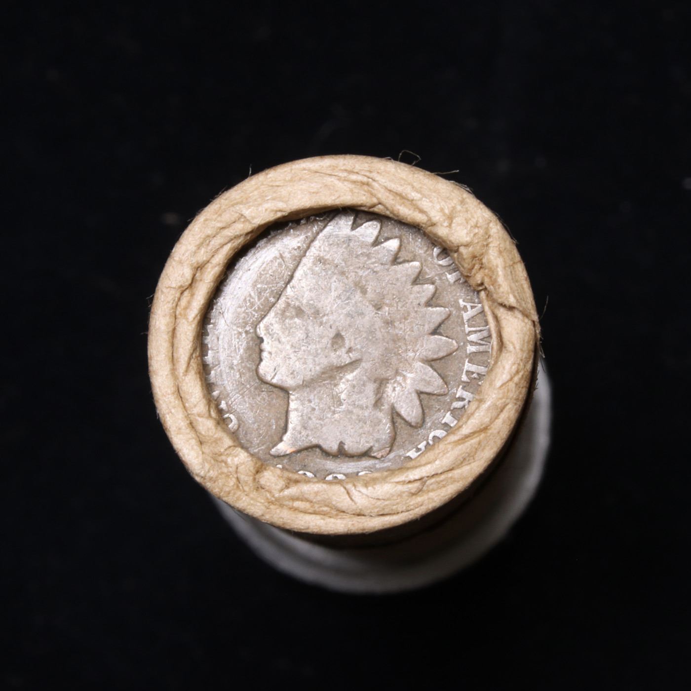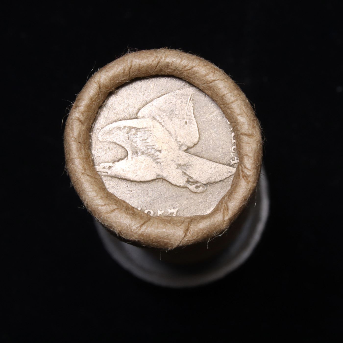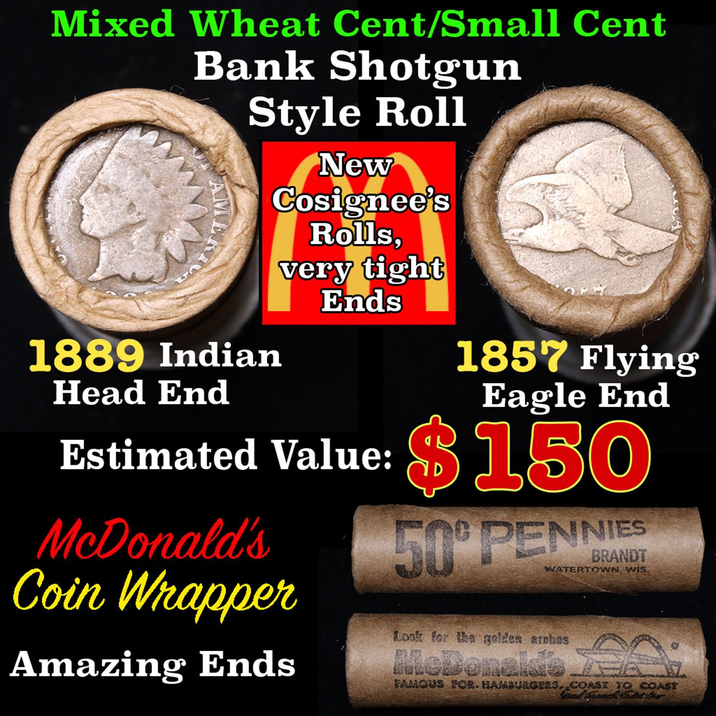 Mixed small cents 1c orig shotgun roll, 1857 Flying Eagle cent, 1889 Indian Cent other end, McDnalds Wrapper Grades. The roll is held in an old Rare & Collectable McDonalds Brandt wrapper. Look For The Golden Arches. Actual roll pictured is the roll you will get. A great original bank shotgun roll with very tight ends. We have opened a few of these rolls. They seem to be mixed small cents including Indians, Wheats, Steel cents & some Flying Eagles mixed in. These shotgun rolls are all from a new consignee. They are all frrom one Estate.