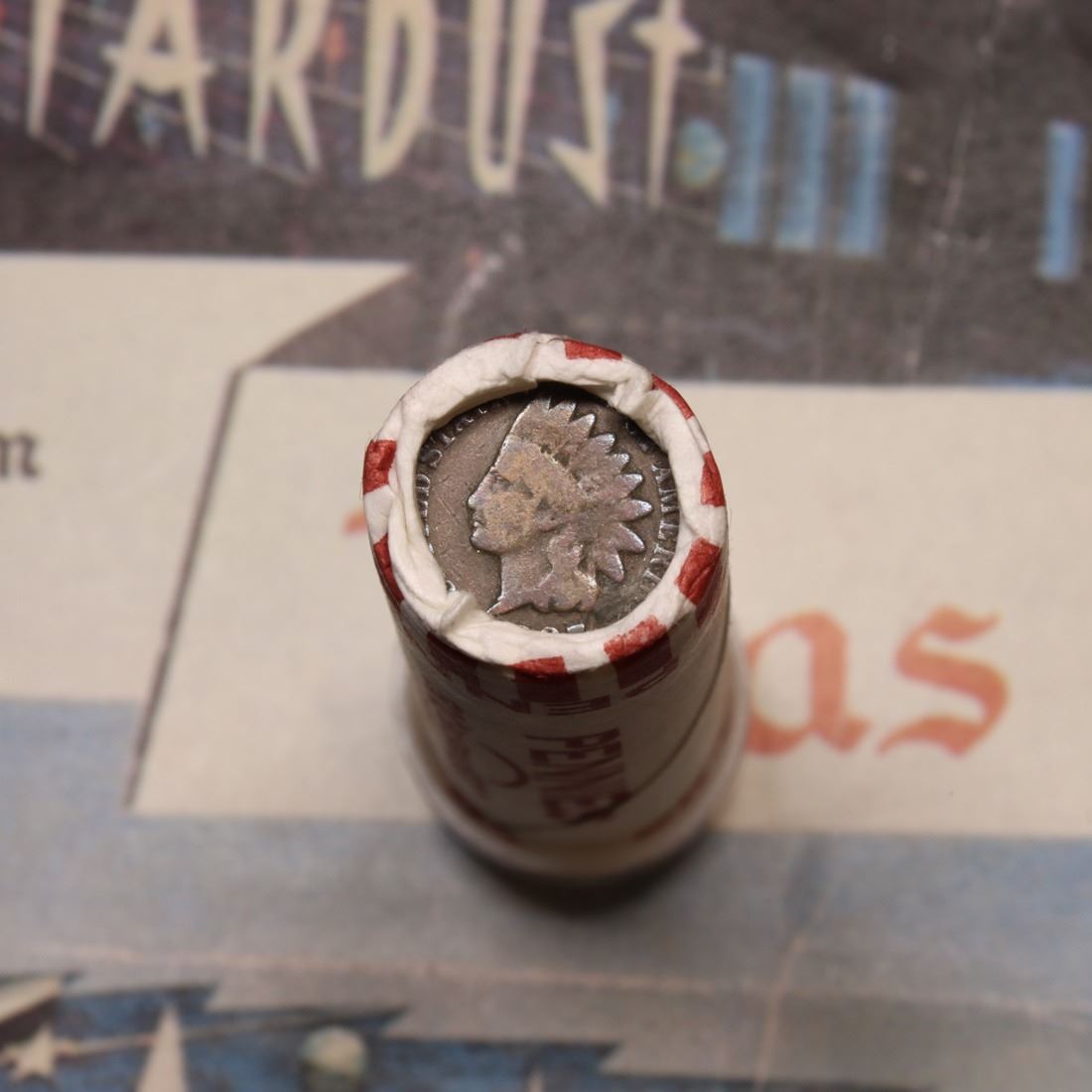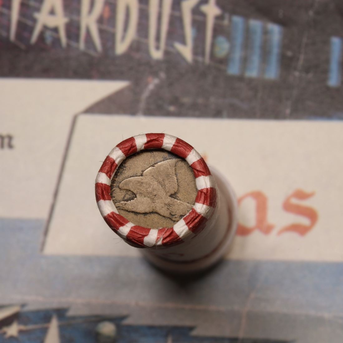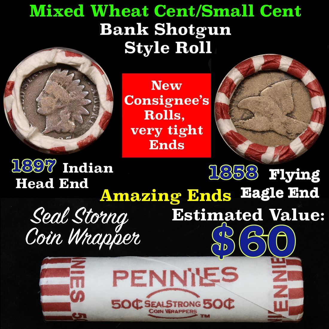 Mixed small cents 1c orig shotgun roll, 1858 Flying Eagle, 1897 Indian Cent other end. The roll is held in an old Seal Strong wrapper. Actual roll pictured is the roll you will get. A great original bank shotgun roll with very tight ends. We have been getting excellent feedback on these rolls. Were being told that close to half the roll are teens, some with mintmarks, there are a few Indians in all the rolls, most of the rolls have steel cents. They seem to be PQ Wheaties rolls. These shotgun rolls are all from a new consignee. They are all frrom one Estate.