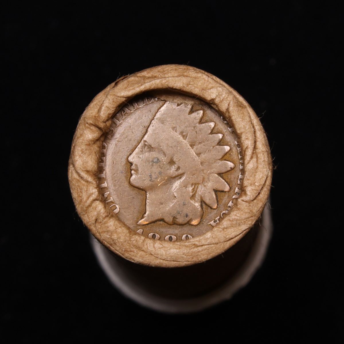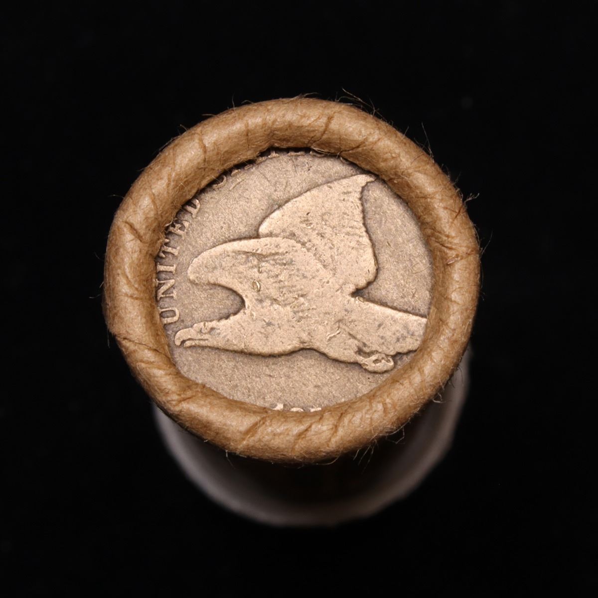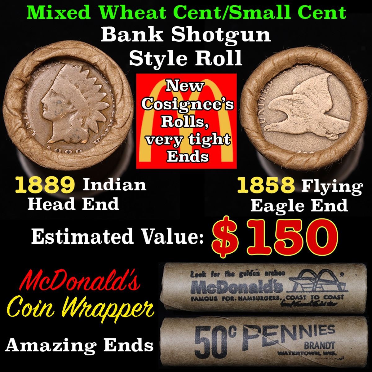 Mixed small cents 1c orig shotgun roll, 1858 Flying Eagle Cent, 1889 Indian Cent other end, McDonald