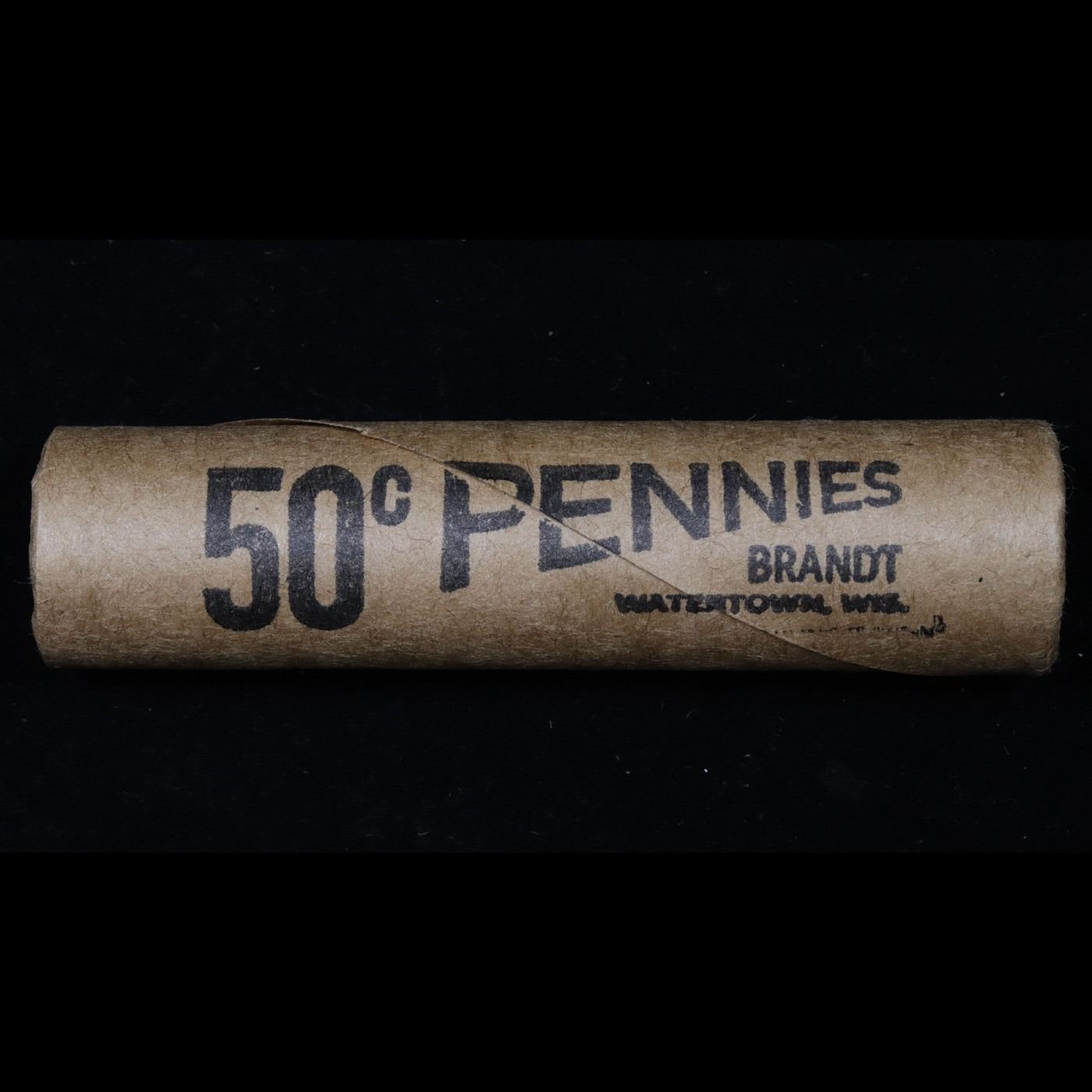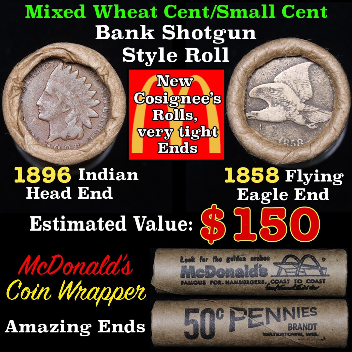 Mixed small cents 1c orig shotgun roll, 1858 Flying Eagle Cent, 1896 Indian Cent other end, McDnalds Wrapper Grades. The roll is held in an old Rare & Collectable McDonalds Brandt wrapper. Look For The Golden Arches. Actual roll pictured is the roll you will get. A great original bank shotgun roll with very tight ends. We have opened a few of these rolls. They seem to be mixed small cents including Indians, Wheats, Steel cents & some Flying Eagles mixed in. These shotgun rolls are all from a new consignee. They are all frrom one Estate.