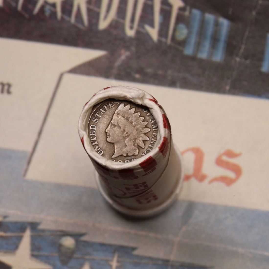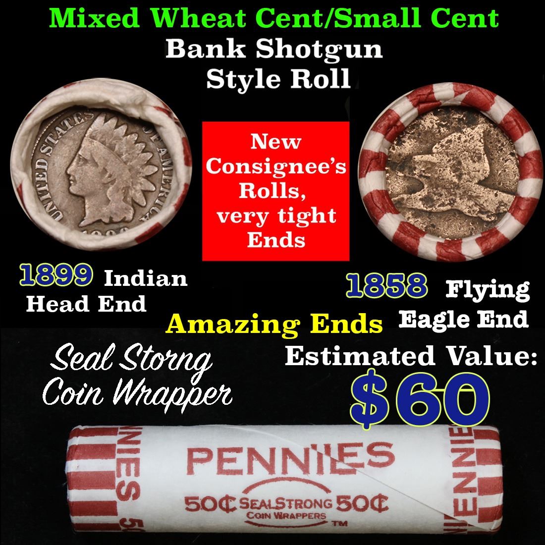Mixed small cents 1c orig shotgun roll, 1858 Flying Eagle Cent, 1899 Indian Cent other end. The roll is held in an old Seal Strong wrapper. Actual roll pictured is the roll you will get. A great original bank shotgun roll with very tight ends. We have been getting excellent feedback on these rolls. Were being told that close to half the roll are teens, some with mintmarks, there are a few Indians in all the rolls, most of the rolls have steel cents. They seem to be PQ Wheaties rolls. These shotgun rolls are all from a new consignee. They are all frrom one Estate.