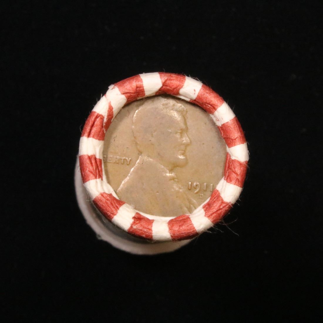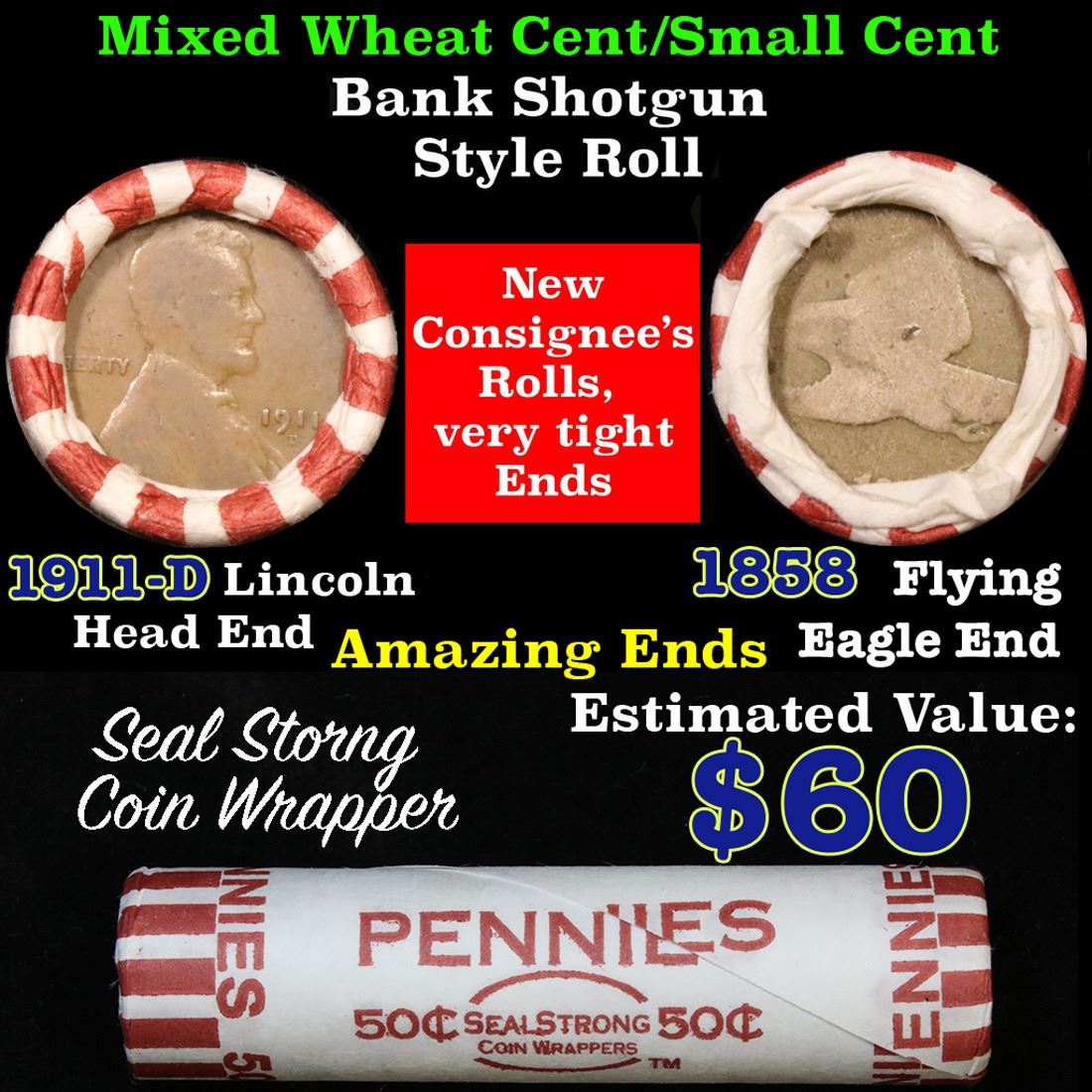 Mixed small cents 1c orig shotgun roll, 1858 Flying Eagle Cent, 1911-d Wheat Cent other end.        The roll is held in an old Seal Strong wrapper.  Actual roll pictured is the roll you will get.  A great original bank shotgun roll with very tight ends.  We have been getting excellent feedback on these rolls.  Were being told that close to half the roll are teens, some with mintmarks, there are a few Indians in all the rolls, most of the rolls have steel cents.  They seem to be PQ Wheaties rolls.  These shotgun rolls are all from a new consignee.  They are all frrom one Estate.