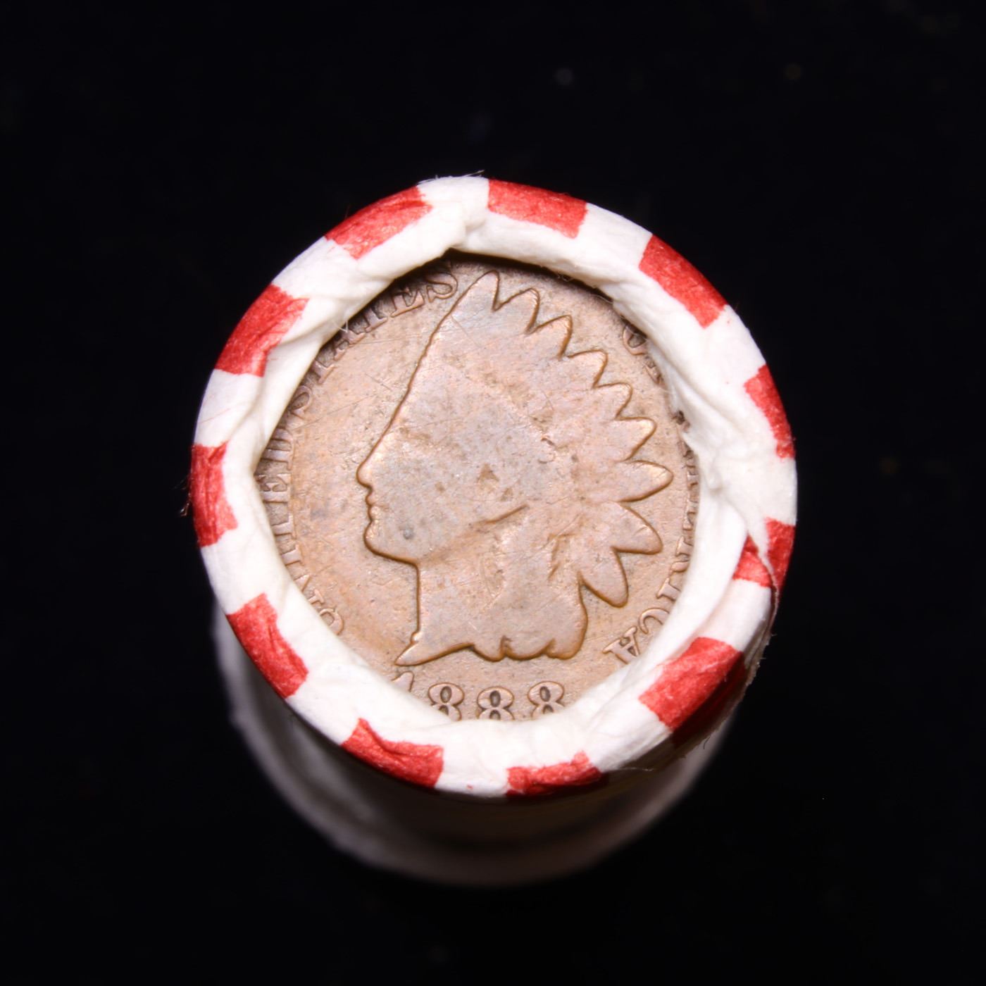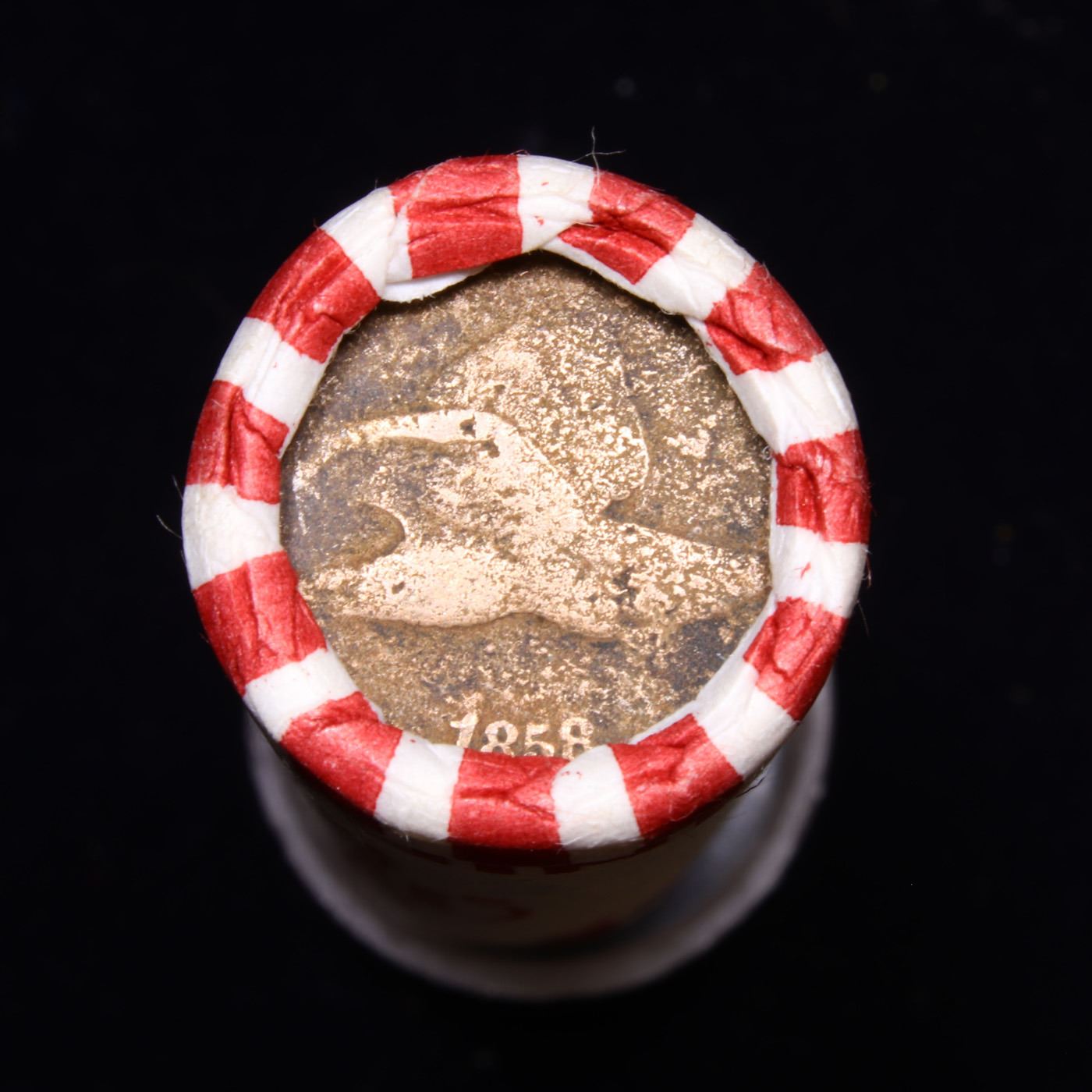 Mixed small cents 1c orig shotgun roll, 1858 Flying Eagle cent, 1888 Indian Cent other end, Seal Str