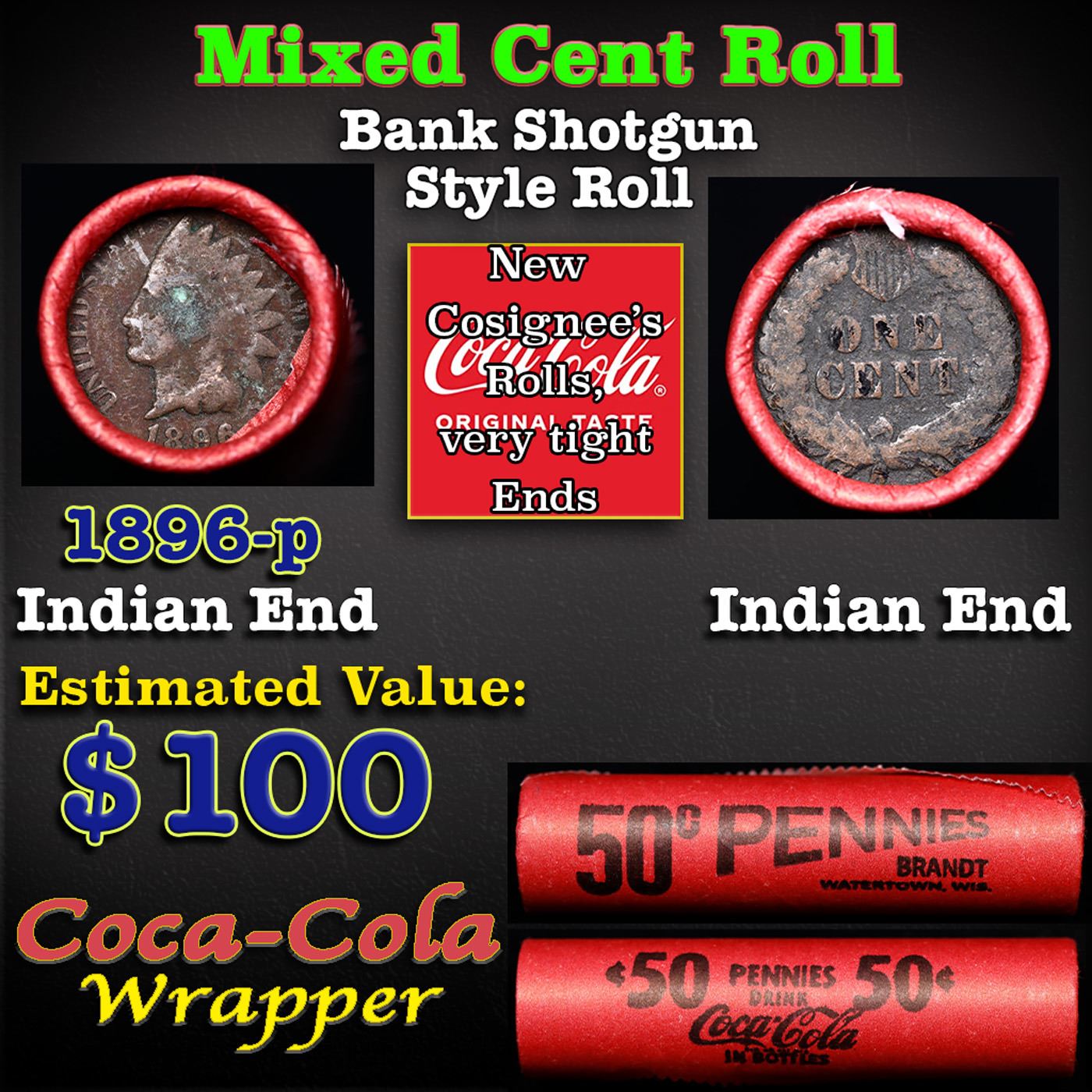 Mixed small cents 1c orig shotgun roll, 1896 Indian Cent, Indian other end, Coca Cola Wrapper. Actual roll pictured is the roll you will get. A Brandt wrapper stamped Coca-Cola. A great original bank shotgun roll with very tight ends. We have opened a few of these rolls. They seem to be mixed small cents including Indians, Wheats, Steel cents & some Flying Eagles mixed in. These shotgun rolls are all from a new consignee. They are all frrom one Estate.