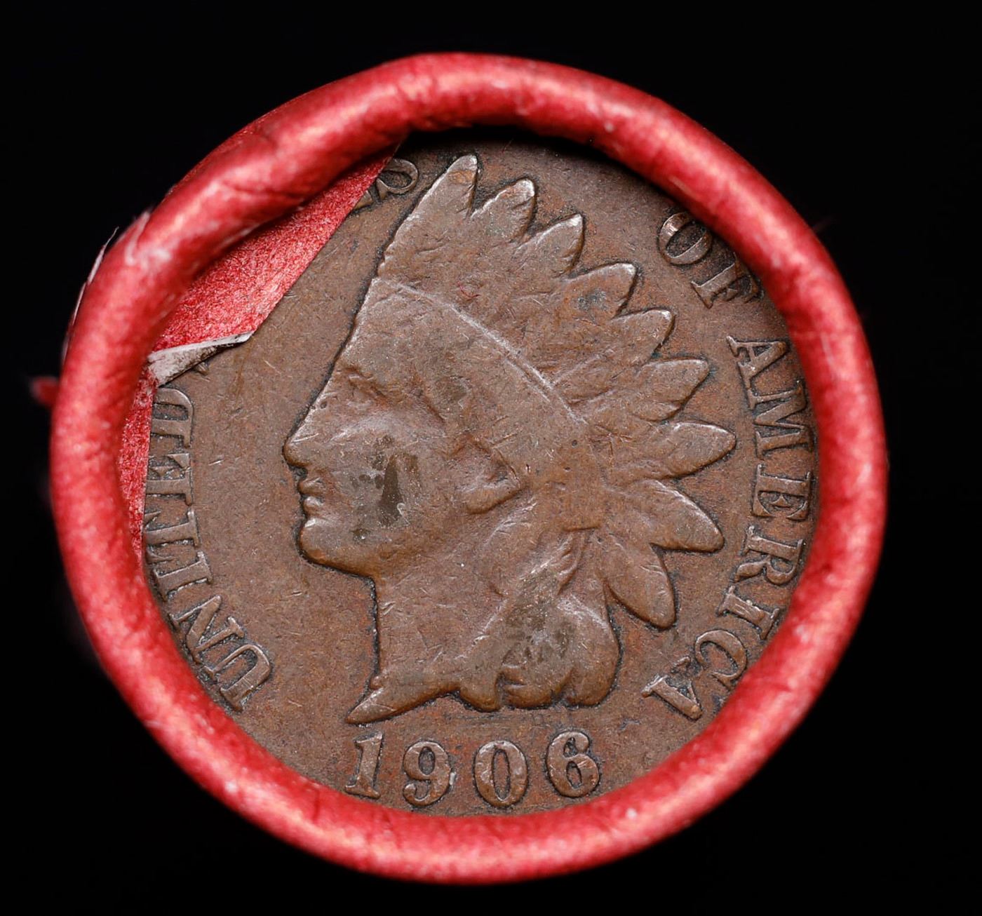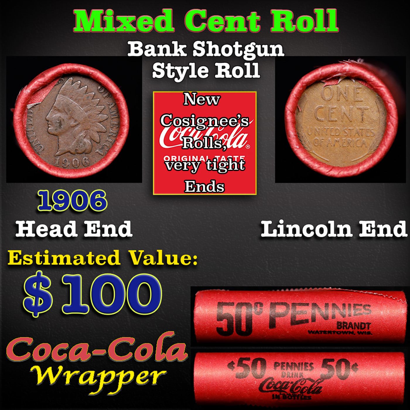 Mixed small cents 1c orig shotgun roll, 1906 Indian Cent, Wheat Cent other end, Coca-Cola Brandt Wra