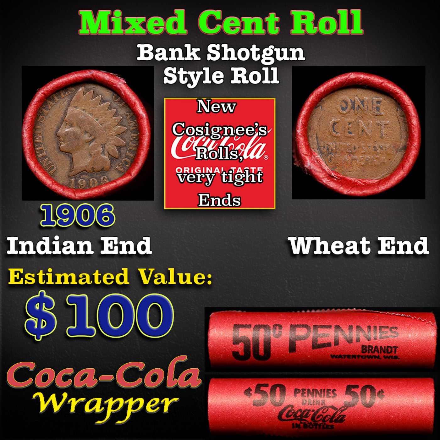 Mixed small cents 1c orig shotgun roll, 1906 Indian Cent, Wheat Cent other end, Coca-Cola Brandt Wrapper.. The roll is held in an old Rare & Collectable Brinks 'Only Brinks Can Open This Safe, Chicago IL' Penny wrapper. Actual roll pictured is the roll you will get. A great original bank shotgun roll with very tight ends. We have opened a few of these rolls. They seem to be mixed small cents including Indians, Wheats, Steel cents & some Flying Eagles mixed in. These shotgun rolls are all from a new consignee. They are all frrom one Estate.