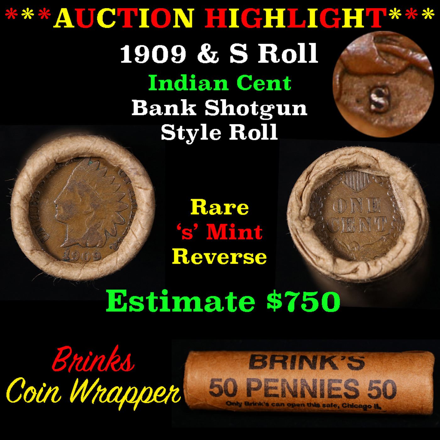 Mixed small cents 1c orig shotgun roll, 1909 Indian Cent, S other end, Brinks Wrapper Grades. The roll is held in an old Rare & Collectable Brinks Wrapper. Actual roll pictured is the roll you will get. A great original bank shotgun roll with very tight ends. We have opened a few of these rolls. They seem to be mixed small cents including Indians, Wheats, Steel cents & some Flying Eagles mixed in. These shotgun rolls are all from a new consignee. They are all frrom one Estate.