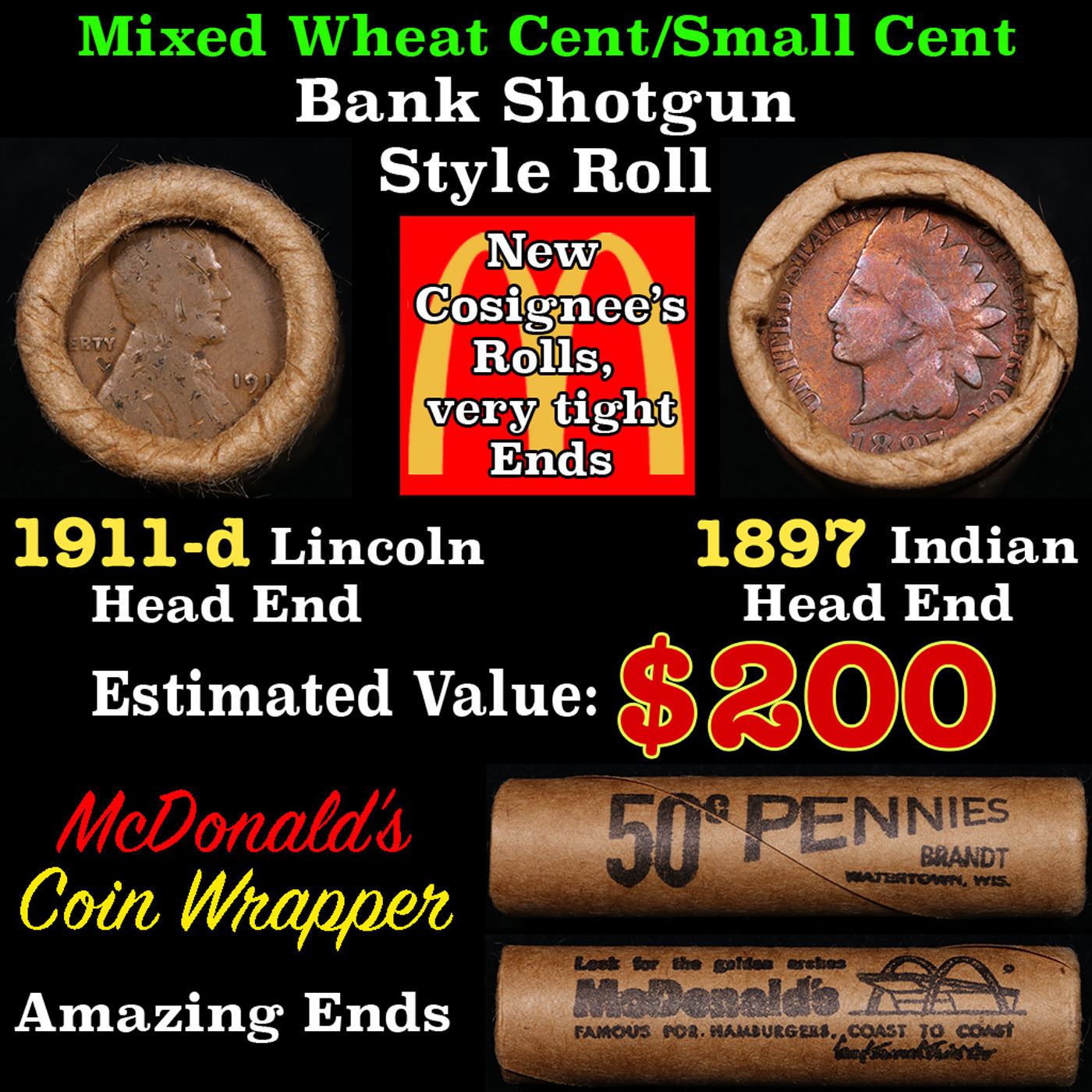 Mixed small cents 1c orig shotgun roll, 1911-d Wheat Cent, 1897 Indian Cent other end, McDonalds Wra