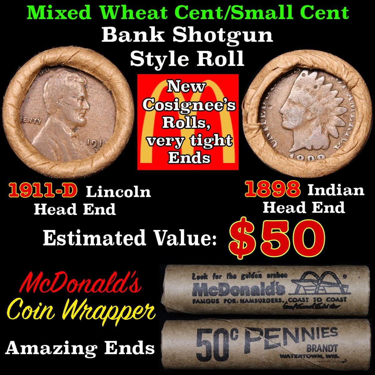 Mixed small cents 1c orig shotgun roll, 1911-d Wheat Cent, 1898 Indian Cent other end . .. The roll is held in an old Rare & Collectable McDonalds Brandt wrapper. Actual roll pictured is the roll you will get. A great original bank shotgun roll with very tight ends. We have opened a few of these rolls. They seem to be mixed small cents including Indians, Wheats, Steel cents & some Flying Eagles mixed in. These shotgun rolls are all from a new consignee. They are all frrom one Estate.
