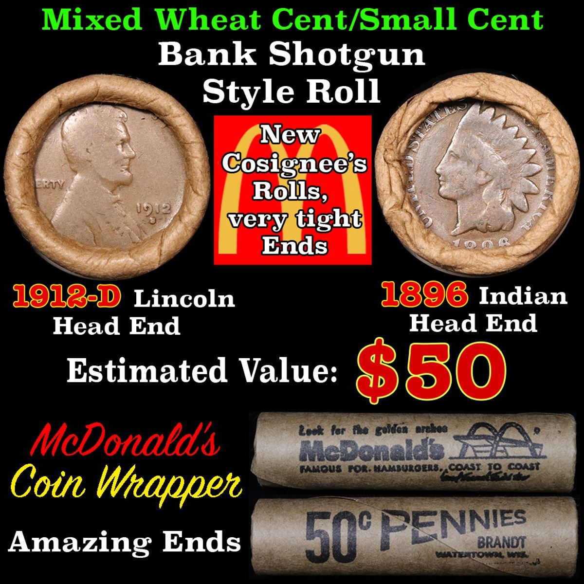 Mixed small cents 1c orig shotgun roll, 1912-d Wheat Cent, 1896 Indian Cent other end. The roll is held in an old Rare & Collectable McDonalds Brandt wrapper. Actual roll pictured is the roll you will get. A great original bank shotgun roll with very tight ends. We have opened a few of these rolls. They seem to be mixed small cents including Indians, Wheats, Steel cents & some Flying Eagles mixed in. These shotgun rolls are all from a new consignee. They are all frrom one Estate.