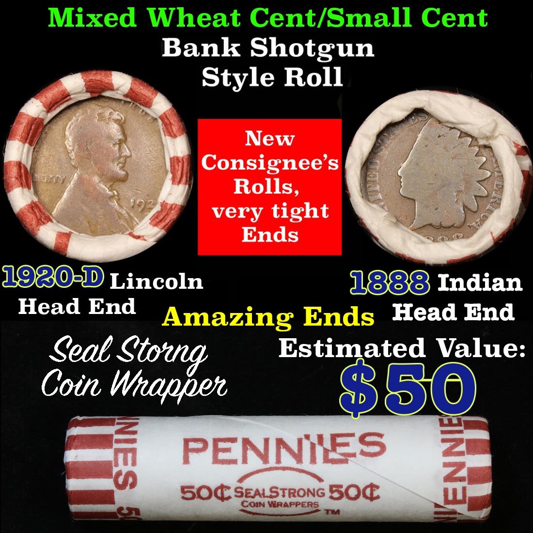 Mixed small cents 1c orig shotgun roll, 19120-d Wheat Cent, 1888 Indian Cent other end. The roll is held in an old Seal Strong wrapper. Actual roll pictured is the roll you will get. A great original bank shotgun roll with very tight ends. We have been getting excellent feedback on these rolls. Were being told that close to half the roll are teens, some with mintmarks, there are a few Indians in all the rolls, most of the rolls have steel cents. They seem to be PQ Wheaties rolls. These shotgun rolls are all from a new consignee. They are all frrom one Estate.