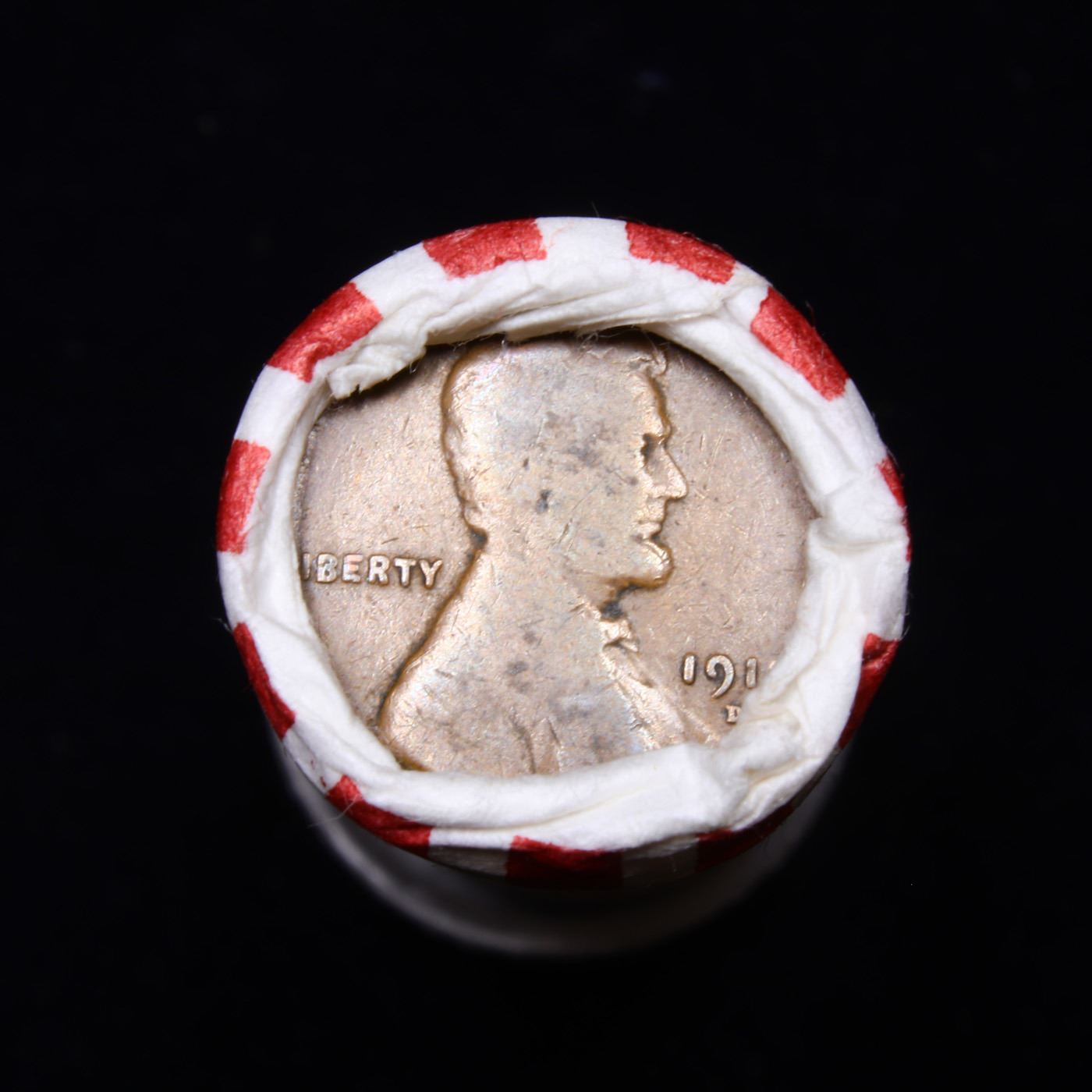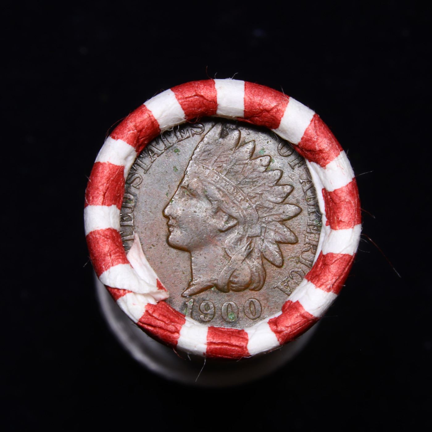 Mixed small cents 1c orig shotgun roll, 1913-d Wheat Cent, 1900 Indian cent other end, Seal Strong W