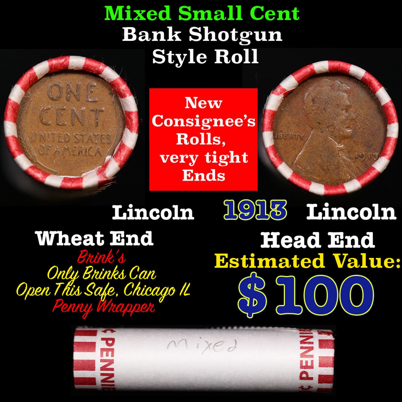 Mixed small cents 1c orig shotgun roll, 1913-p Lincoln Cent, Wheat Cent other end, Brinks Wrapper.. The roll is held in an old Rare & Collectable Brinks 'Only Brinks Can Open This Safe, Chicago IL' Penny wrapper. Actual roll pictured is the roll you will get. A great original bank shotgun roll with very tight ends. We have opened a few of these rolls. They seem to be mixed small cents including Indians, Wheats, Steel cents & some Flying Eagles mixed in. These shotgun rolls are all from a new consignee. They are all frrom one Estate.