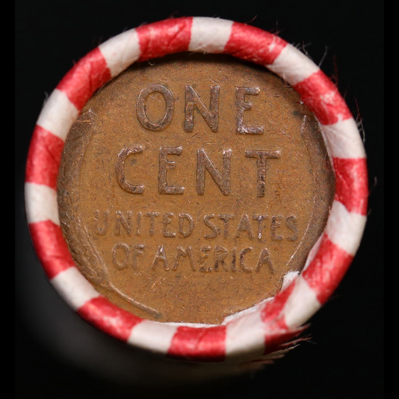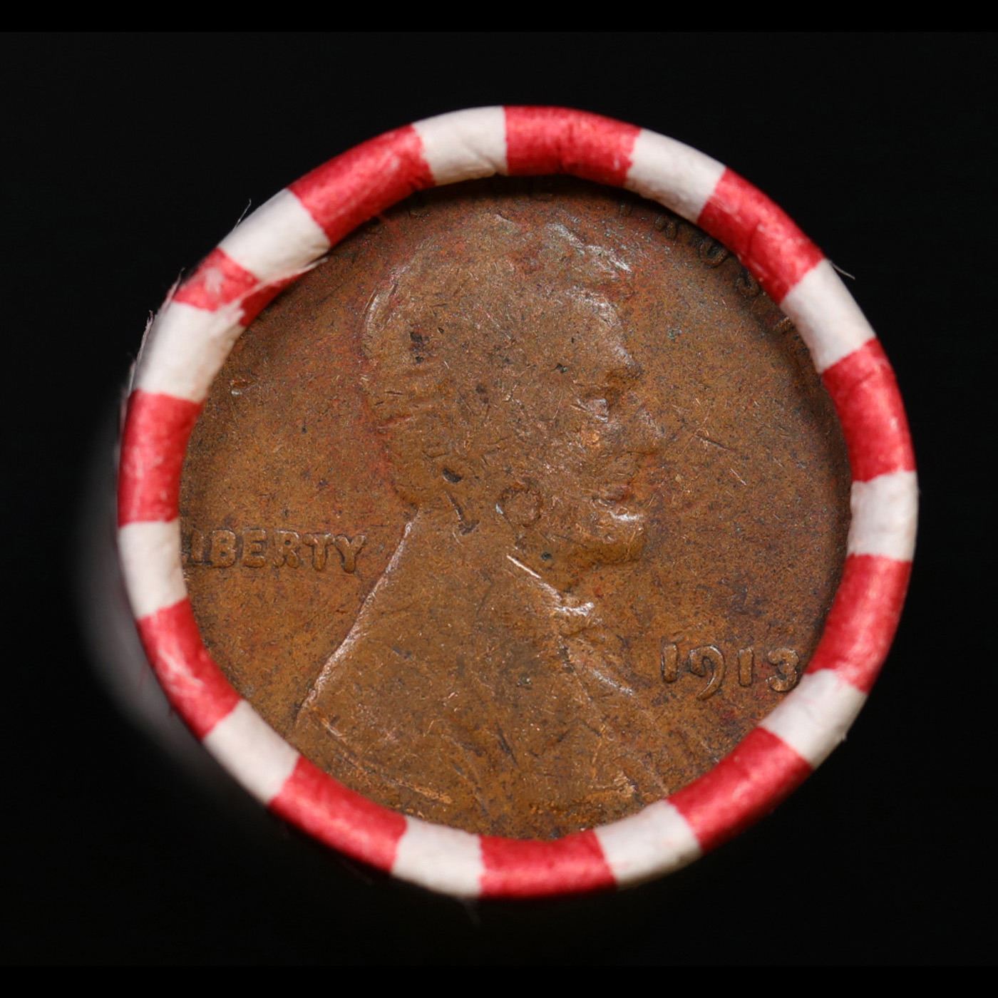 Mixed small cents 1c orig shotgun roll, 1913-p Lincoln Cent, Wheat Cent other end, Brinks Wrapper.
