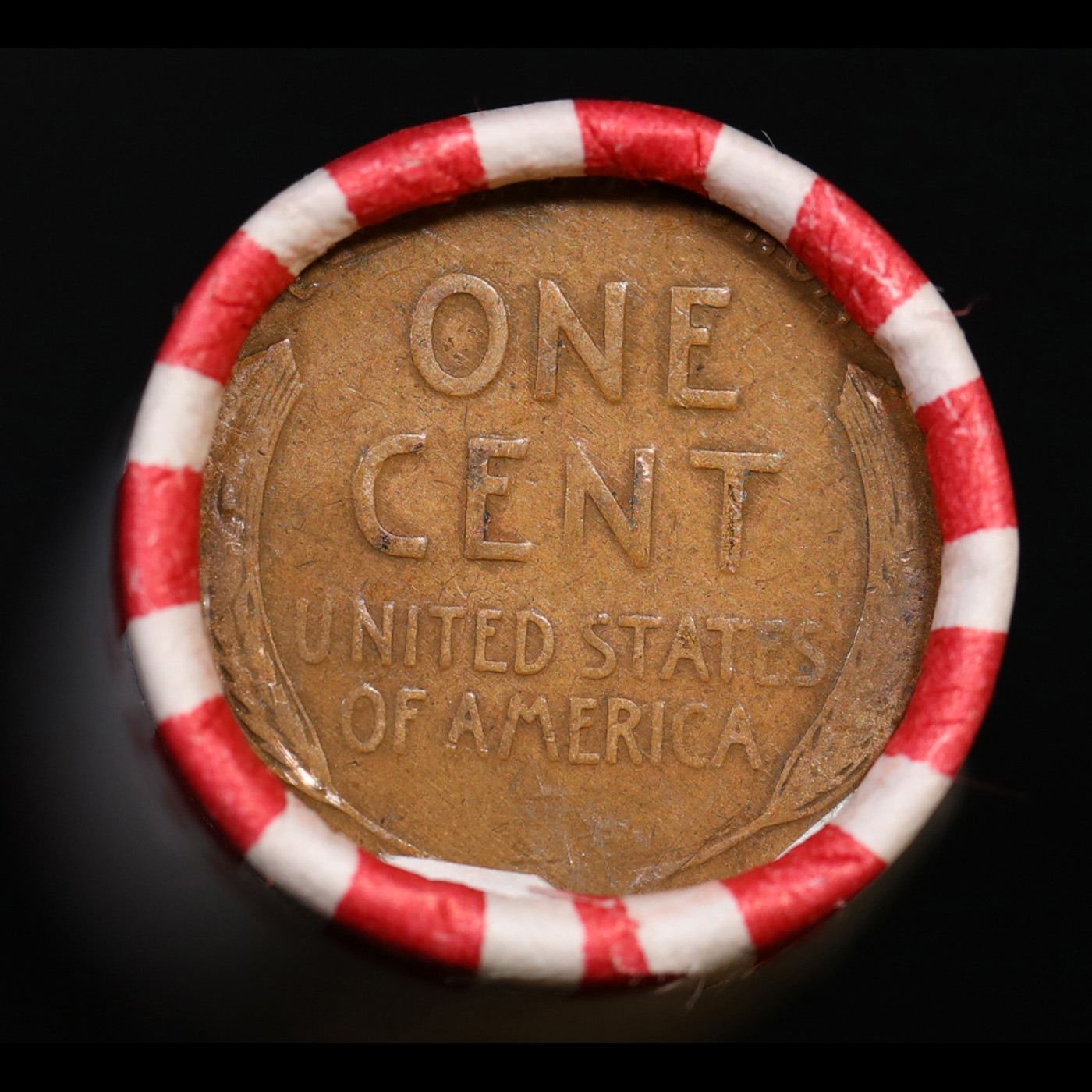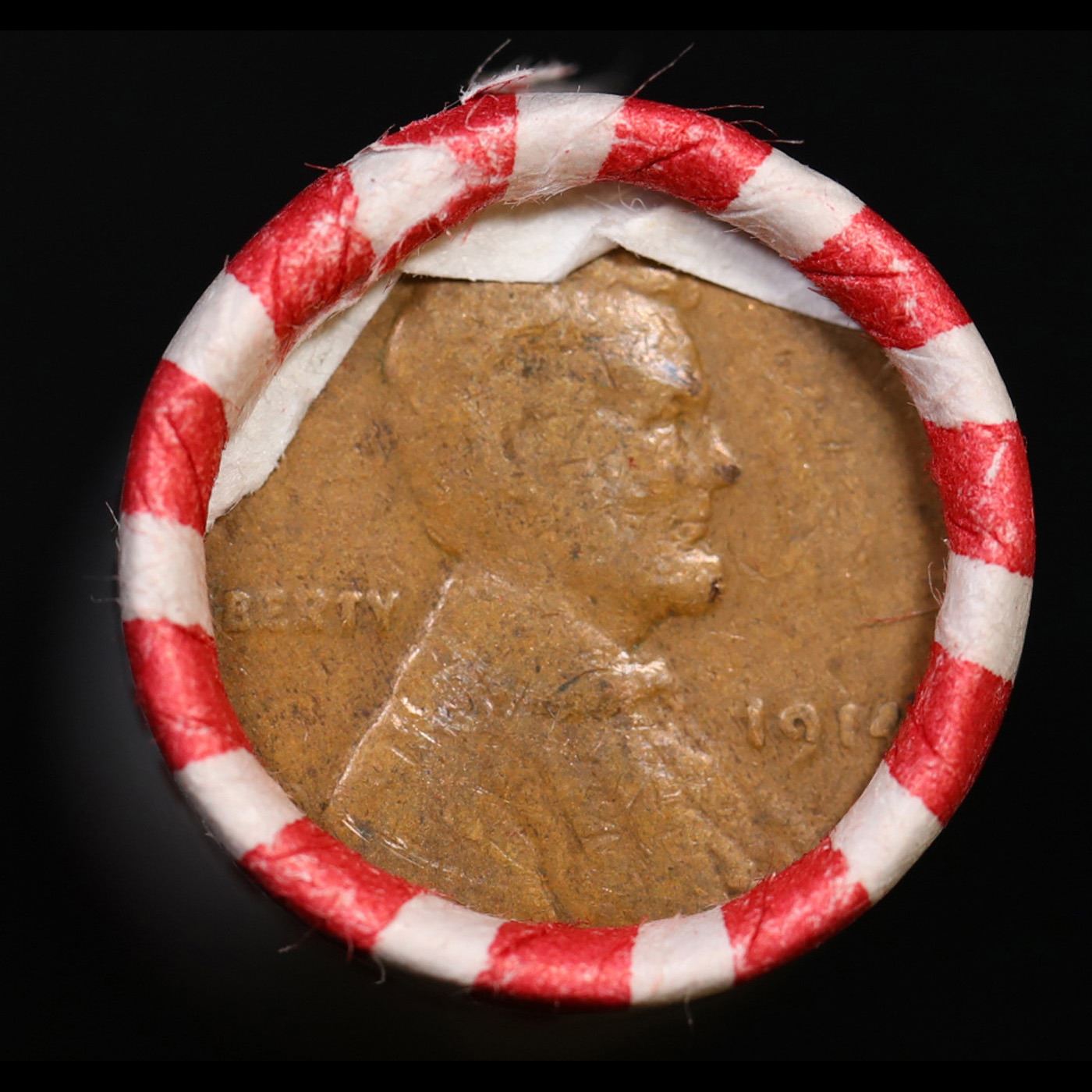 Mixed small cents 1c orig shotgun roll, 1914-p Lincoln Cent, Wheat Cent other end, Brinks Wrapper.