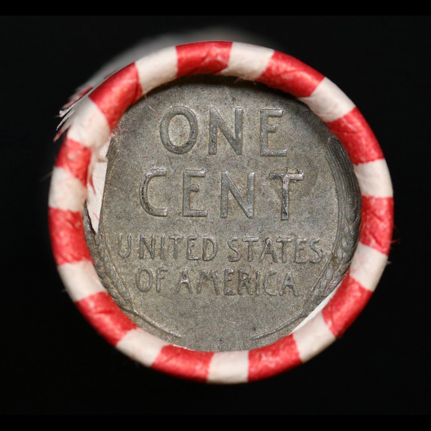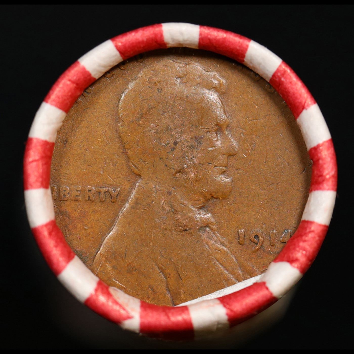 Mixed small cents 1c orig shotgun roll, 1914-p Wheat Cent, Steel Cent other end, Brinks Wrapper.