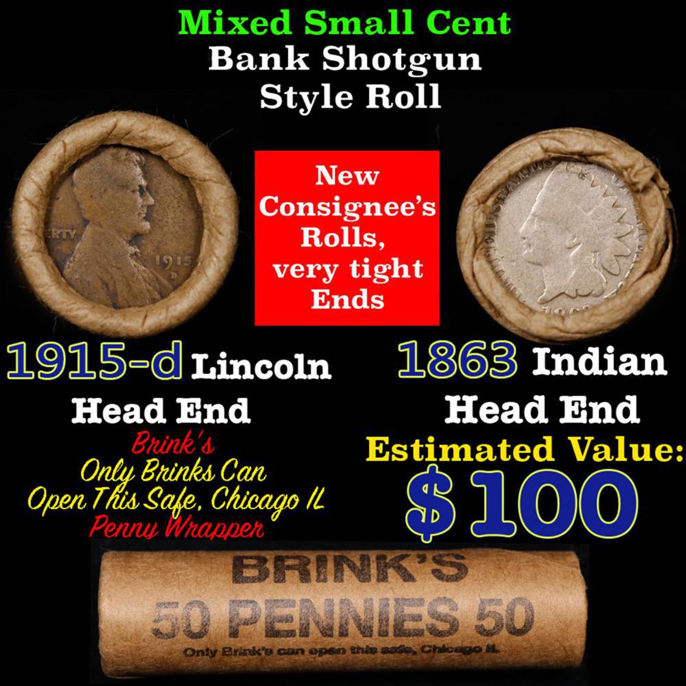 Mixed small cents 1c orig shotgun roll, 1915-d Wheat Cent, 1863 Indian Cent other end, Brinks Wrapper.. The roll is held in an old Rare & Collectable Brinks 'Only Brinks Can Open This Safe, Chicago IL' Penny wrapper. Actual roll pictured is the roll you will get. A great original bank shotgun roll with very tight ends. We have opened a few of these rolls. They seem to be mixed small cents including Indians, Wheats, Steel cents & some Flying Eagles mixed in. These shotgun rolls are all from a new consignee. They are all frrom one Estate.