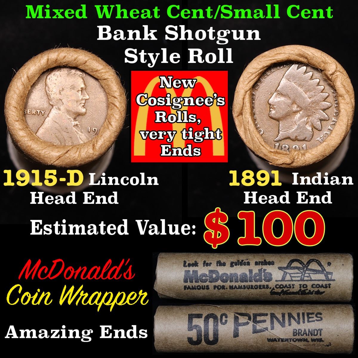 Mixed small cents 1c orig shotgun roll, 1915-d Wheat Cent, 1891 Indian Cent other end, McDonalds Wrapper. The roll is held in an old Rare & Collectable McDonalds Brandt wrapper. Look For The Golden Arches. Actual roll pictured is the roll you will get. A great original bank shotgun roll with very tight ends. We have opened a few of these rolls. They seem to be mixed small cents including Indians, Wheats, Steel cents & some Flying Eagles mixed in. These shotgun rolls are all from a new consignee. They are all frrom one Estate.