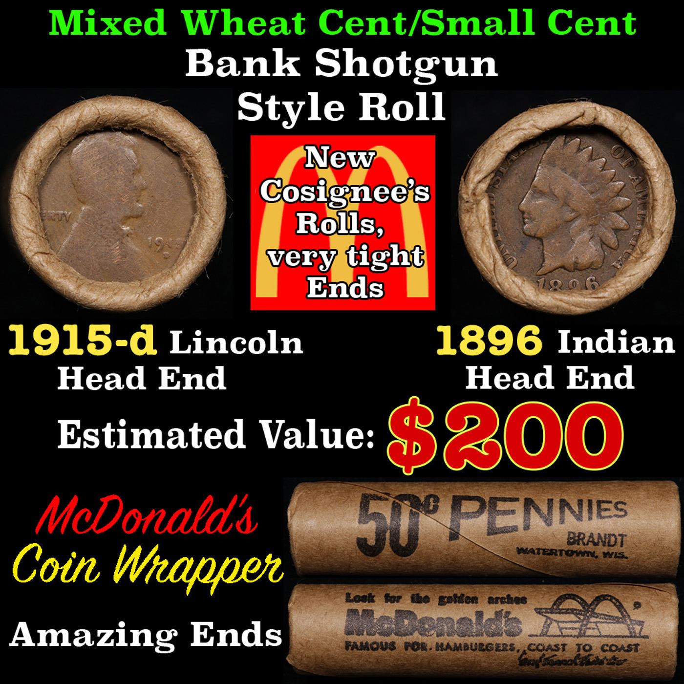 Mixed small cents 1c orig shotgun roll, 1915-d Wheat Cent, 1896 Indian Cent other end, McDonalds Wra