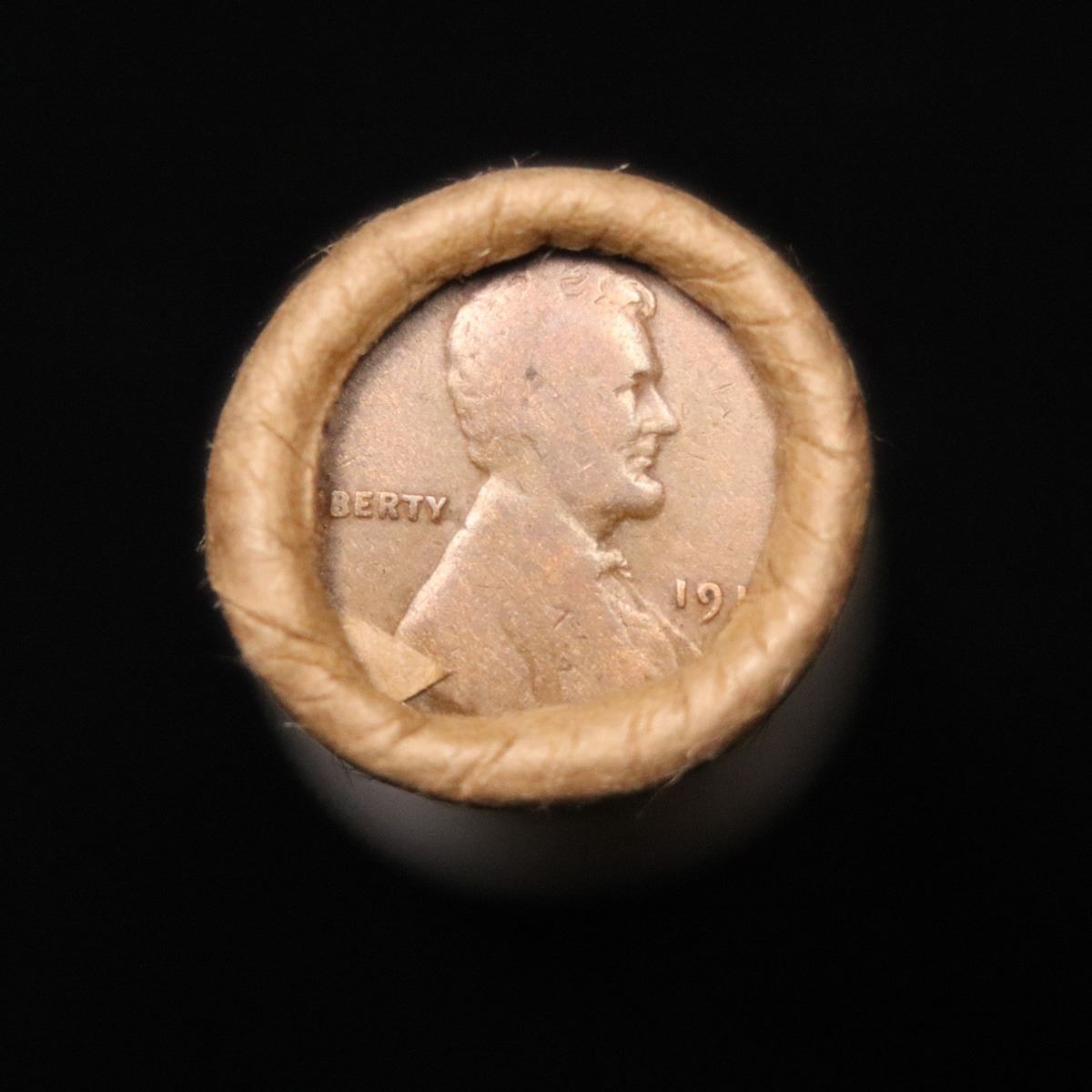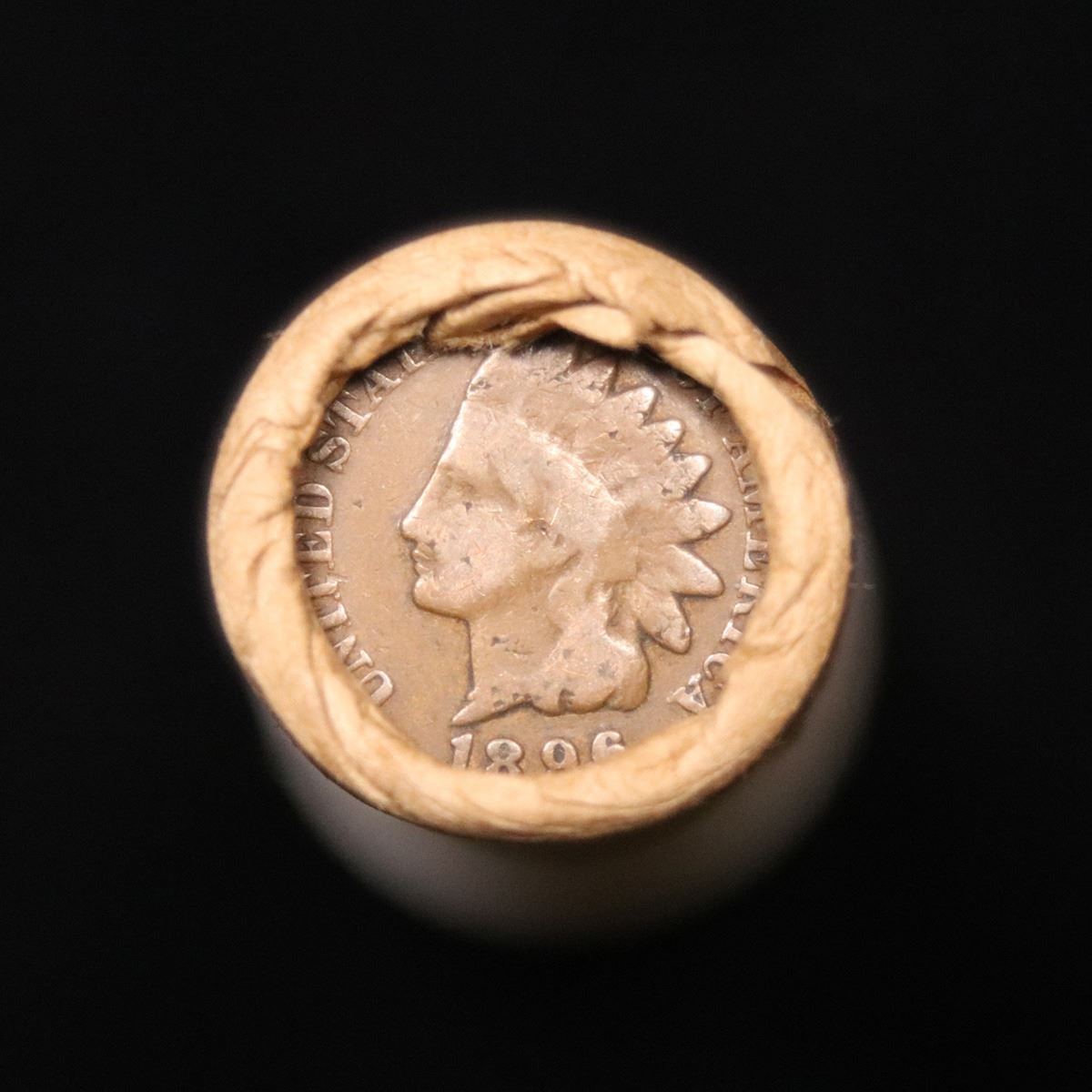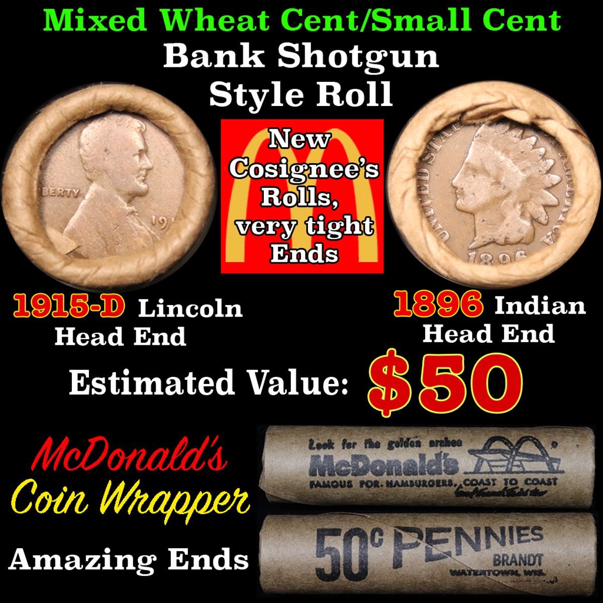 Mixed small cents 1c orig shotgun roll, 1915-d Wheat Cent, 1896 Indian Cent other end . .. The roll is held in an old Rare & Collectable McDonalds Brandt wrapper. Actual roll pictured is the roll you will get. A great original bank shotgun roll with very tight ends. We have opened a few of these rolls. They seem to be mixed small cents including Indians, Wheats, Steel cents & some Flying Eagles mixed in. These shotgun rolls are all from a new consignee. They are all frrom one Estate.