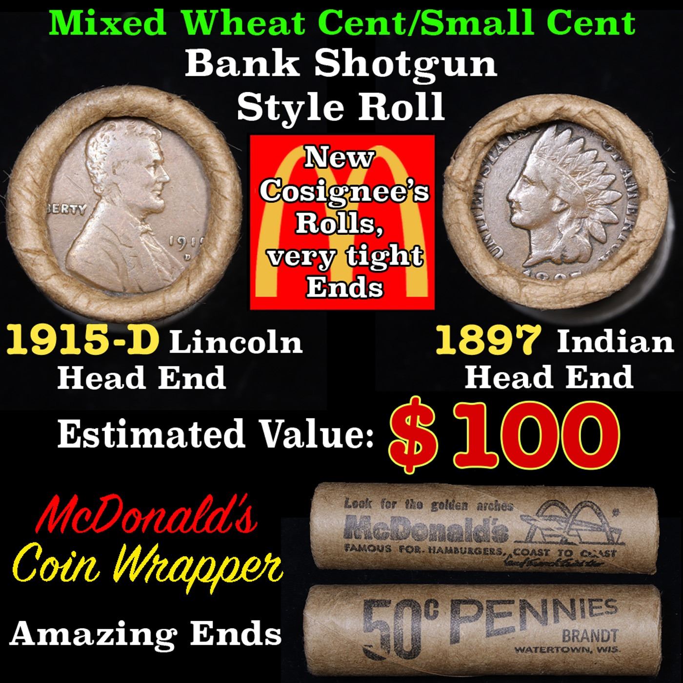 Mixed small cents 1c orig shotgun roll, 1915-d Wheat Cent, 1897 Indian Cent other end, McDonalds Wra