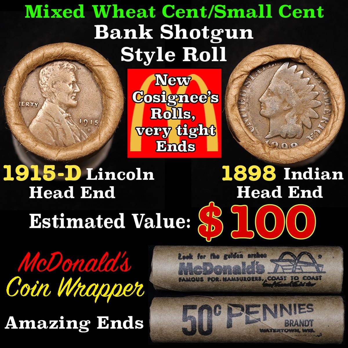 Mixed small cents 1c orig shotgun roll, 1915-d Wheat Cent, 1898 Indian Cent other end,McDnalds Wrapper. The roll is held in an old Rare & Collectable McDonalds Brandt wrapper. Look For The Golden Arches. Actual roll pictured is the roll you will get. A great original bank shotgun roll with very tight ends. We have opened a few of these rolls. They seem to be mixed small cents including Indians, Wheats, Steel cents & some Flying Eagles mixed in. These shotgun rolls are all from a new consignee. They are all frrom one Estate.