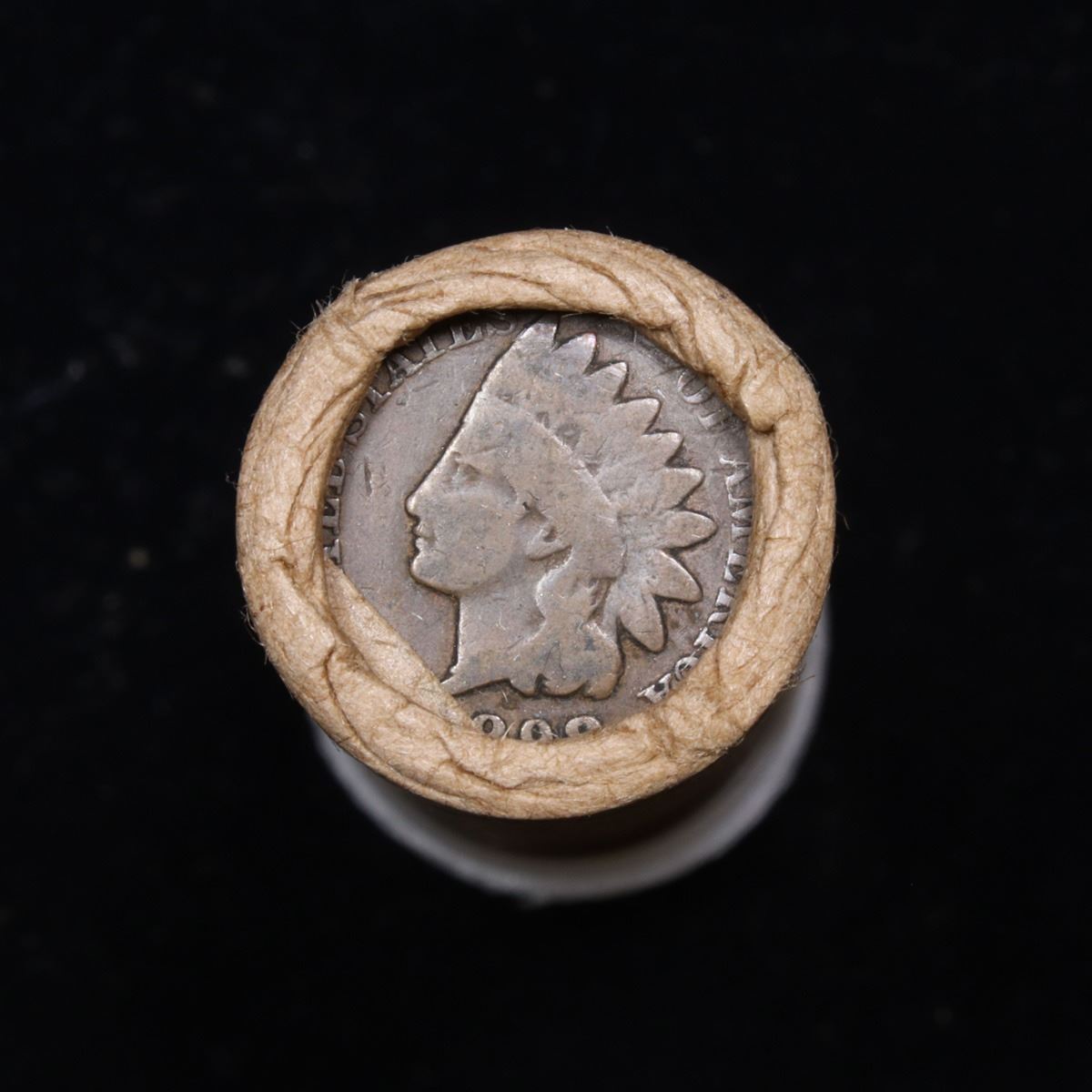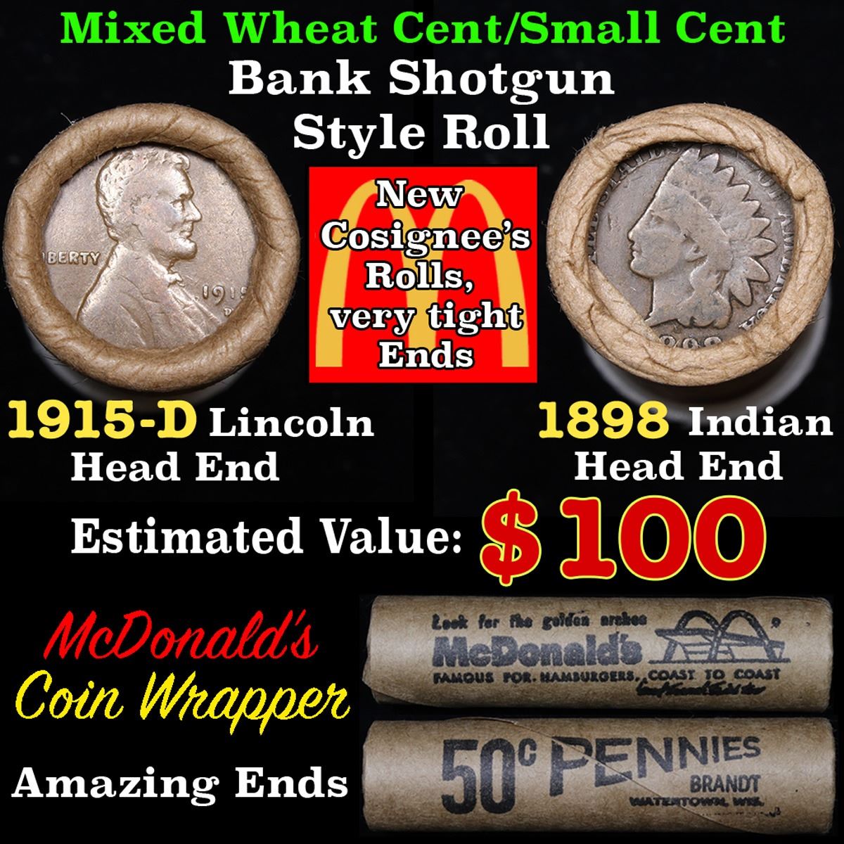 Mixed small cents 1c orig shotgun roll, 1915-d Wheat Cent, 1898 Indian Cent other end,McDnalds Wrapper. The roll is held in an old Rare & Collectable McDonalds Brandt wrapper. Look For The Golden Arches. Actual roll pictured is the roll you will get. A great original bank shotgun roll with very tight ends. We have opened a few of these rolls. They seem to be mixed small cents including Indians, Wheats, Steel cents & some Flying Eagles mixed in. These shotgun rolls are all from a new consignee. They are all frrom one Estate.