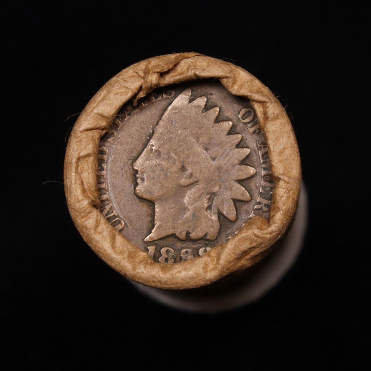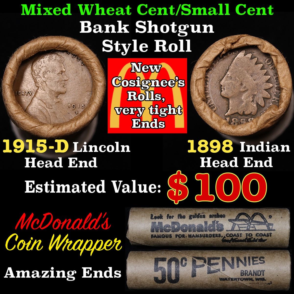 Mixed small cents 1c orig shotgun roll, 1915-d Wheat Cent, 1898 Indian Cent other end, McDonalds Wra