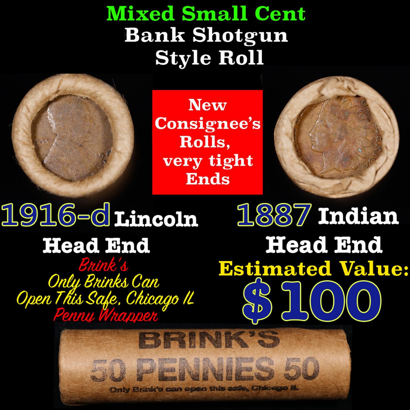 Mixed small cents 1c orig shotgun roll, 1916-D Wheat Cent, 1887 Indian Cent other end, Brinks Wrapper.. The roll is held in an old Rare & Collectable Brinks 'Only Brinks Can Open This Safe, Chicago IL' Penny wrapper. Actual roll pictured is the roll you will get. A great original bank shotgun roll with very tight ends. We have opened a few of these rolls. They seem to be mixed small cents including Indians, Wheats, Steel cents & some Flying Eagles mixed in. These shotgun rolls are all from a new consignee. They are all frrom one Estate.