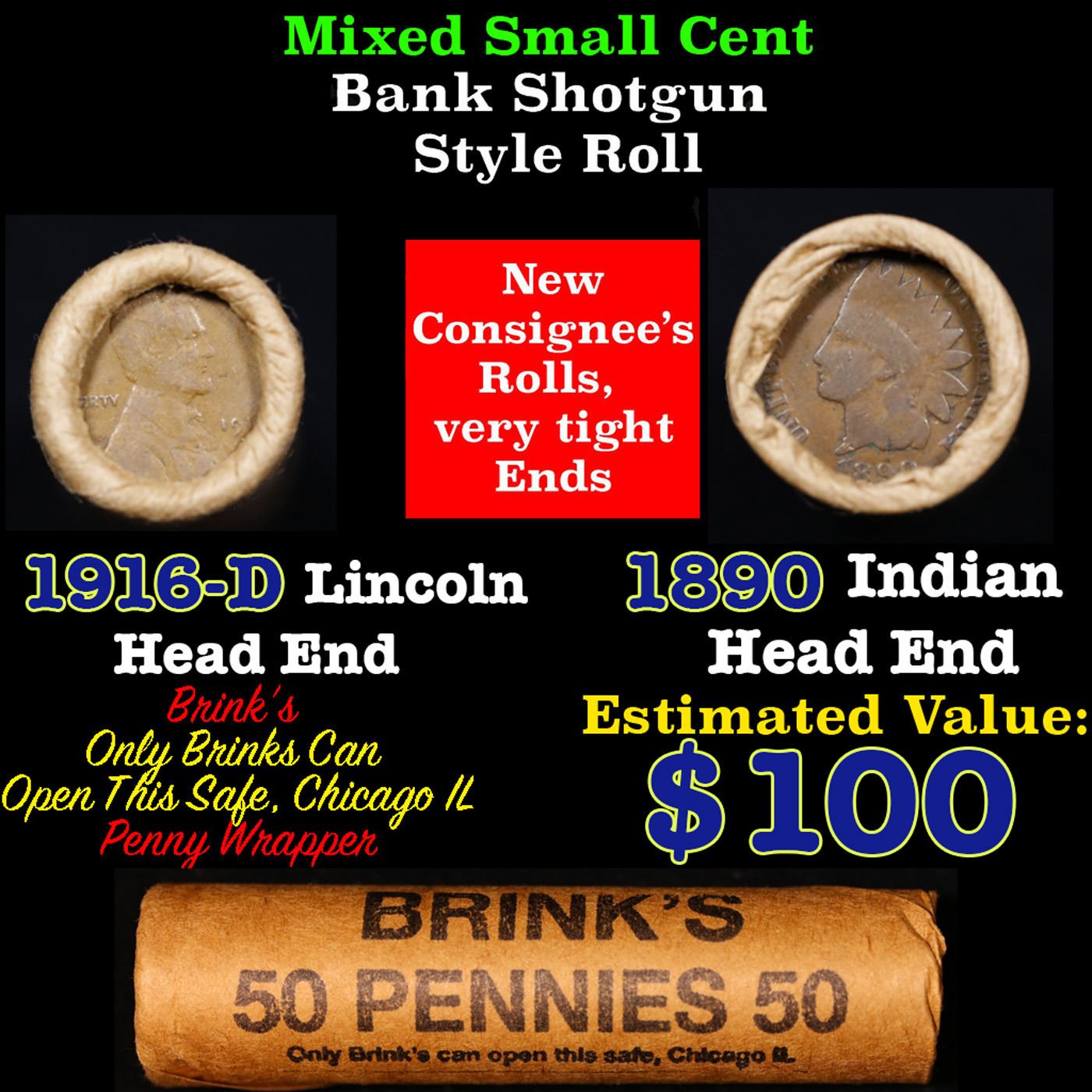 Mixed small cents 1c orig shotgun roll, 1916-D Wheat Cent, 1890 Indian Cent other end, Brinks Wrapper.. The roll is held in an old Rare & Collectable Brinks 'Only Brinks Can Open This Safe, Chicago IL' Penny wrapper. Actual roll pictured is the roll you will get. A great original bank shotgun roll with very tight ends. We have opened a few of these rolls. They seem to be mixed small cents including Indians, Wheats, Steel cents & some Flying Eagles mixed in. These shotgun rolls are all from a new consignee. They are all frrom one Estate.