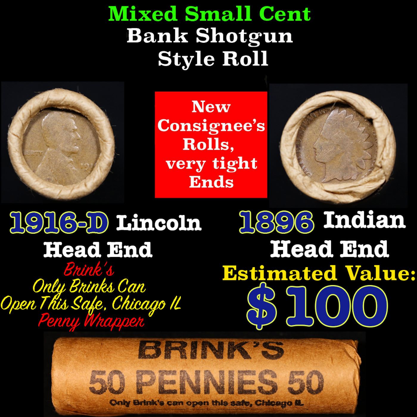 Mixed small cents 1c orig shotgun roll, 1916-D Wheat Cent, 1896 Indian Cent other end, Brinks Wrapper.. The roll is held in an old Rare & Collectable Brinks 'Only Brinks Can Open This Safe, Chicago IL' Penny wrapper. Actual roll pictured is the roll you will get. A great original bank shotgun roll with very tight ends. We have opened a few of these rolls. They seem to be mixed small cents including Indians, Wheats, Steel cents & some Flying Eagles mixed in. These shotgun rolls are all from a new consignee. They are all frrom one Estate.