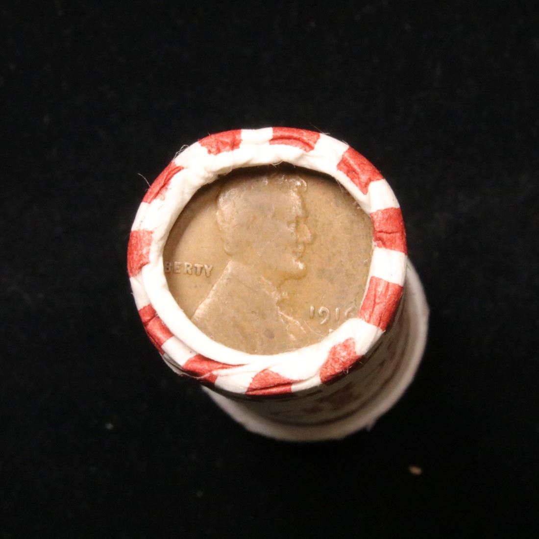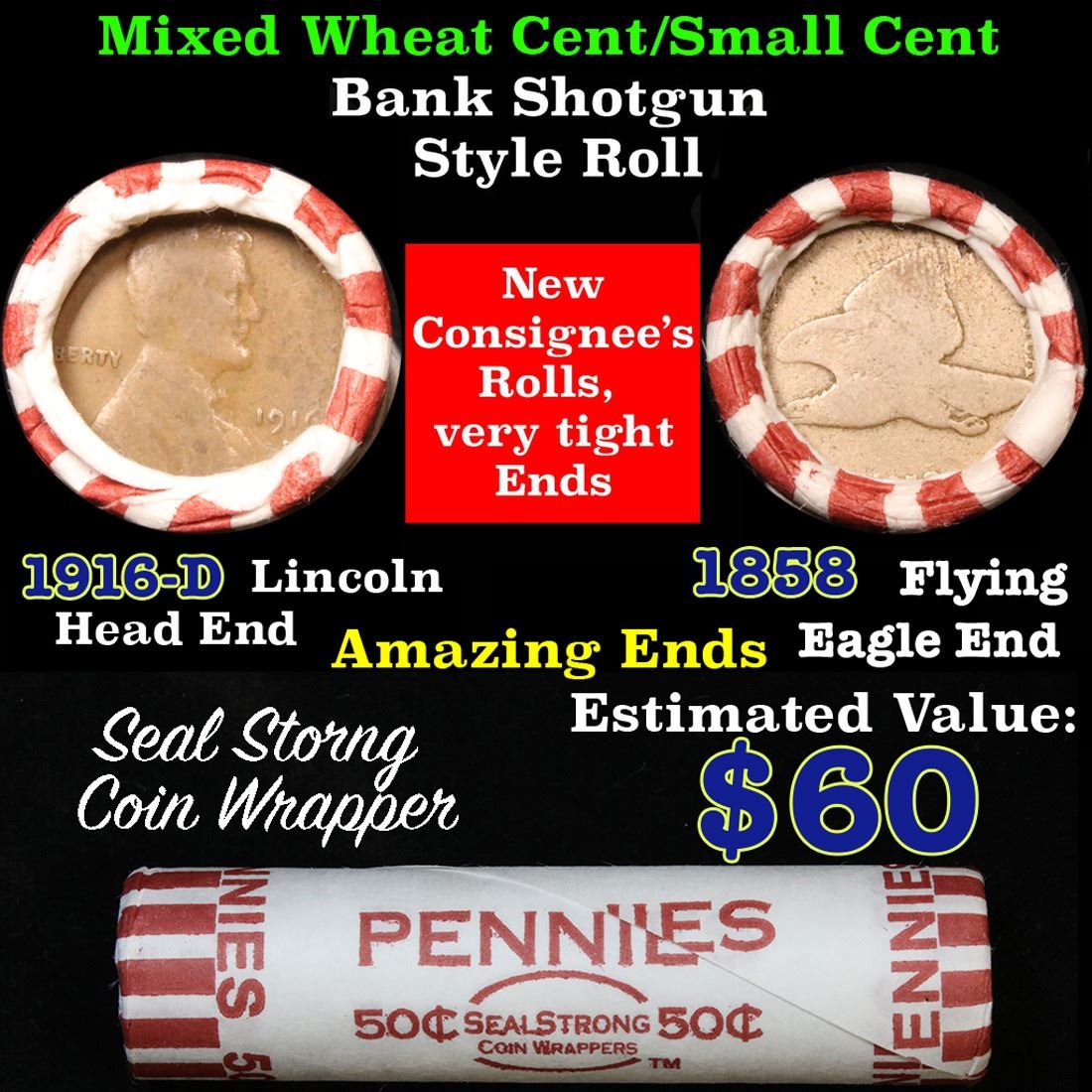 Mixed small cents 1c orig shotgun roll, 1916-d Wheat Cent, 1858 Flying Eagle Cent other end. The roll is held in an old Seal Strong wrapper. Actual roll pictured is the roll you will get. A great original bank shotgun roll with very tight ends. We have been getting excellent feedback on these rolls. Were being told that close to half the roll are teens, some with mintmarks, there are a few Indians in all the rolls, most of the rolls have steel cents. They seem to be PQ Wheaties rolls. These shotgun rolls are all from a new consignee. They are all frrom one Estate.