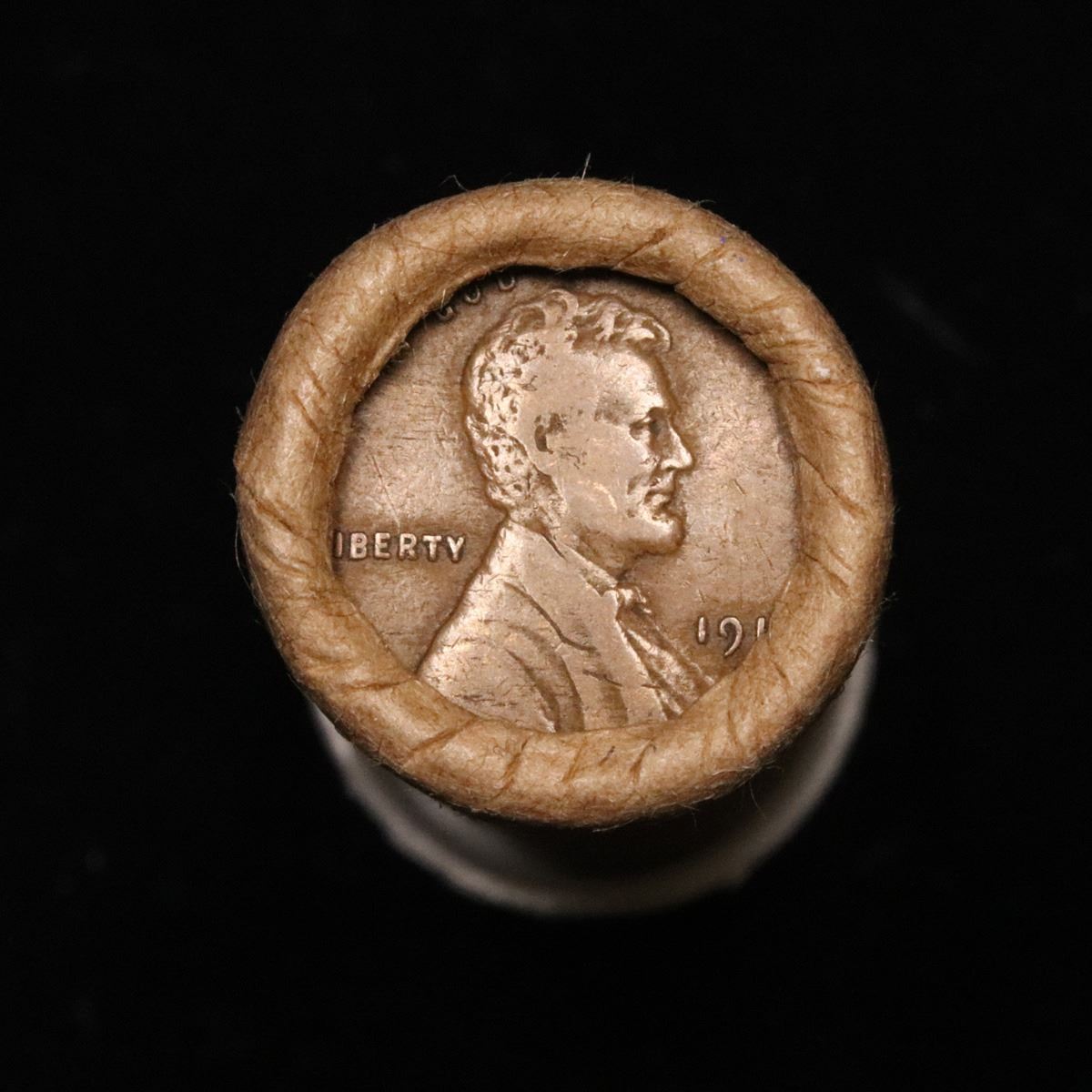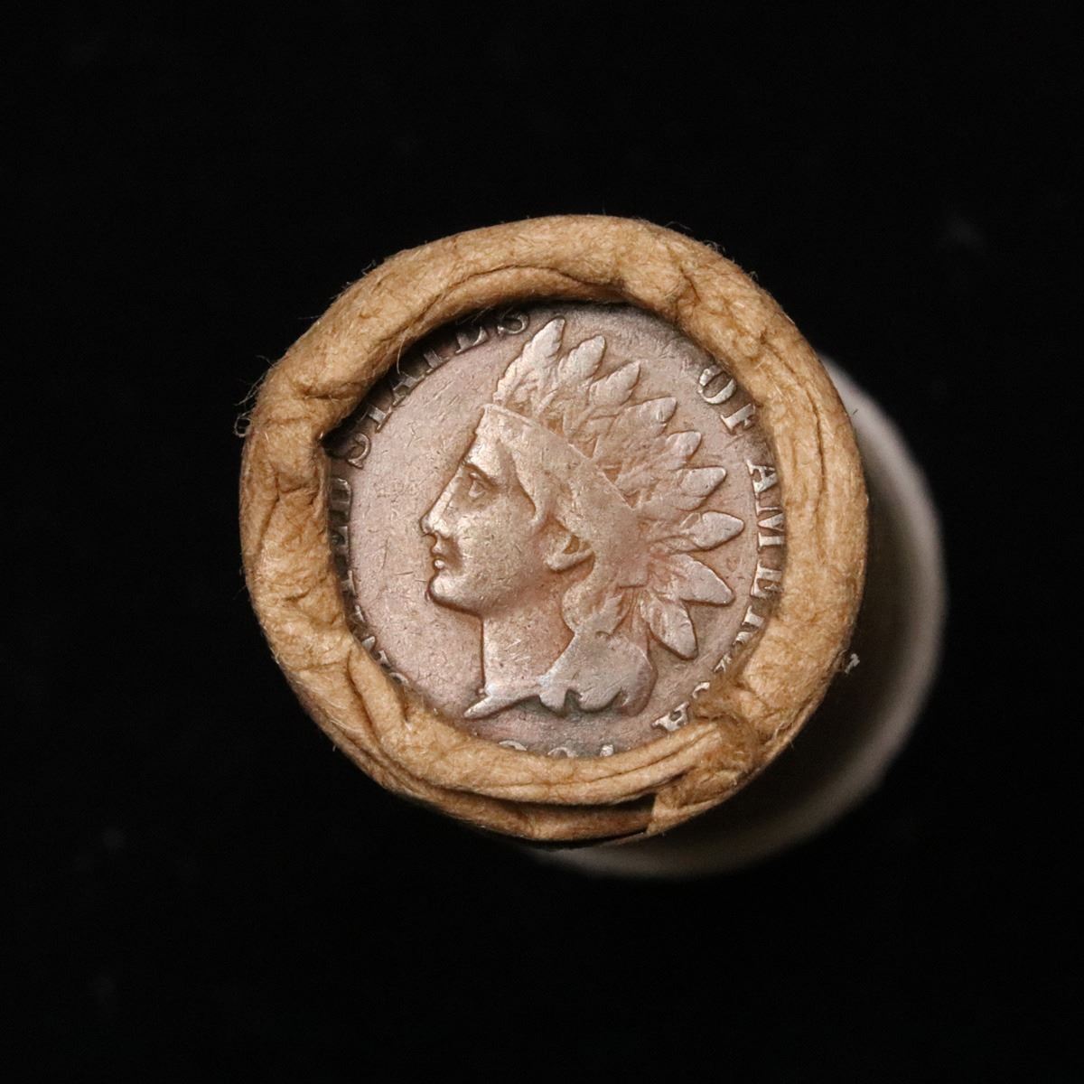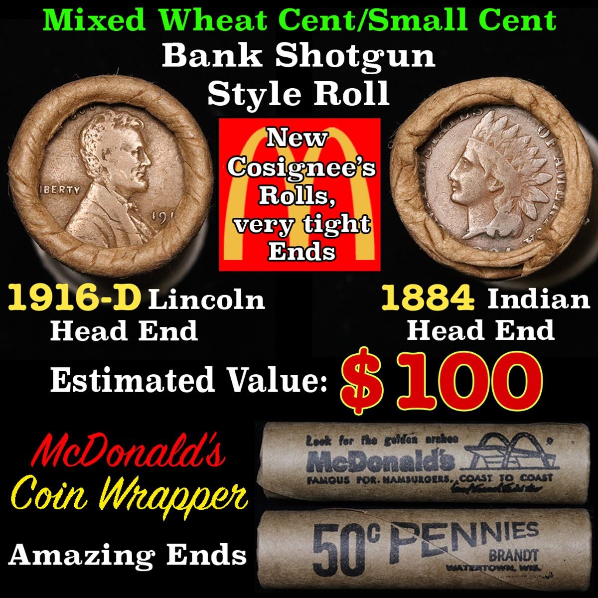 Mixed small cents 1c orig shotgun roll, 1916-d Wheat Cent, 1884 Indian Cent other end. The roll is held in an old Rare & Collectable McDonalds Brandt wrapper. Actual roll pictured is the roll you will get. A great original bank shotgun roll with very tight ends. We have opened a few of these rolls. They seem to be mixed small cents including Indians, Wheats, Steel cents & some Flying Eagles mixed in. These shotgun rolls are all from a new consignee. They are all frrom one Estate.