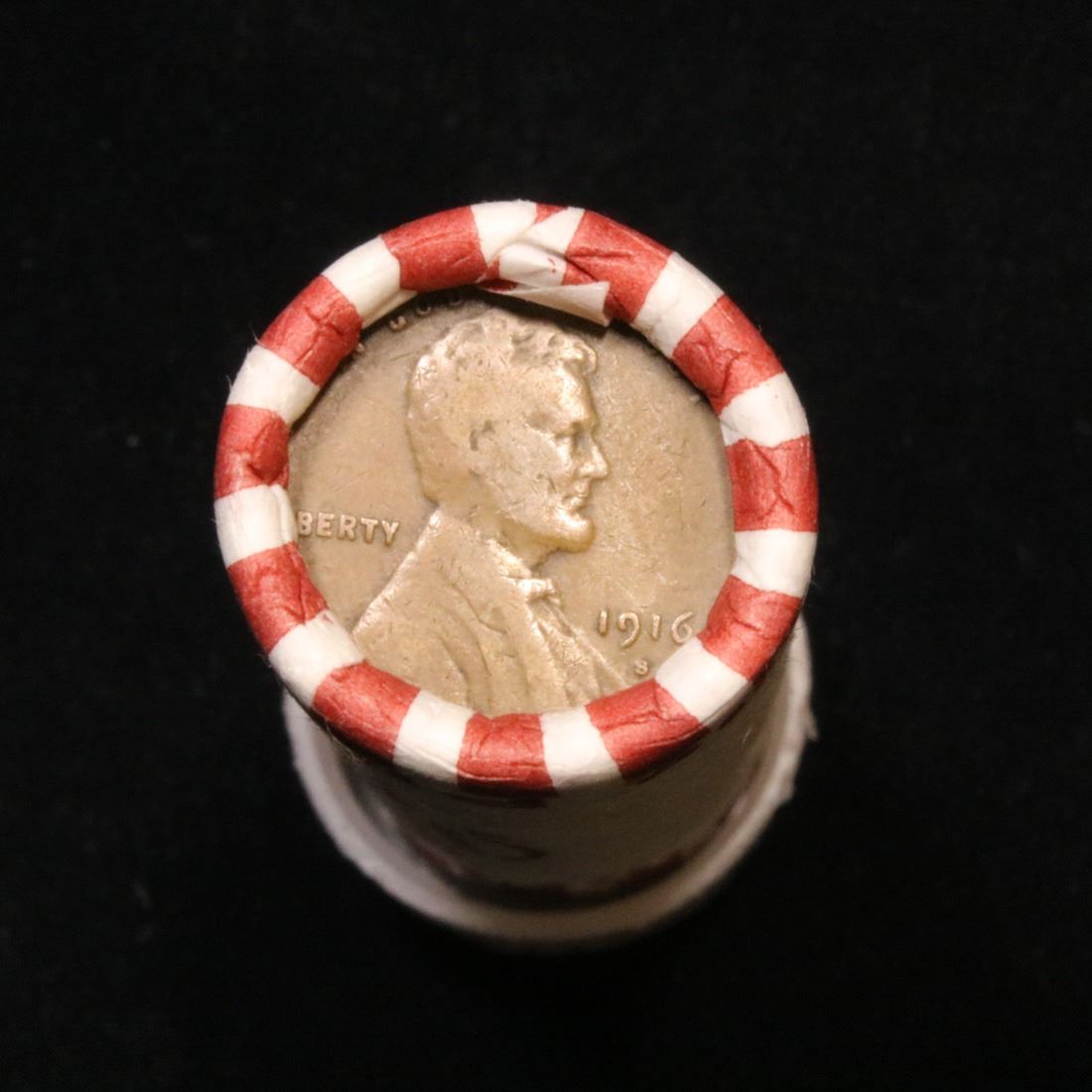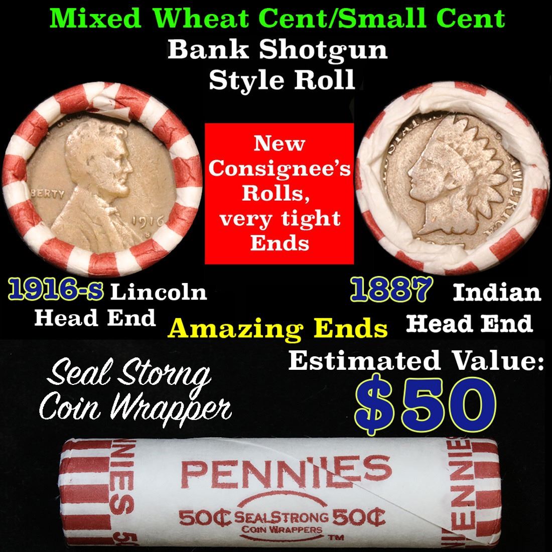 Mixed small cents 1c orig shotgun roll, 1916-d Wheat Cent, 1887 Indian Cent other end. The roll is held in an old Seal Strong wrapper. Actual roll pictured is the roll you will get. A great original bank shotgun roll with very tight ends. We have been getting excellent feedback on these rolls. Were being told that close to half the roll are teens, some with mintmarks, there are a few Indians in all the rolls, most of the rolls have steel cents. They seem to be PQ Wheaties rolls. These shotgun rolls are all from a new consignee. They are all frrom one Estate.