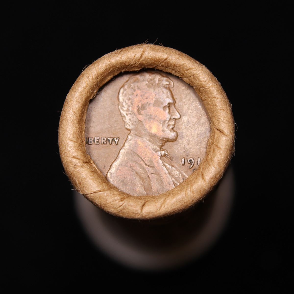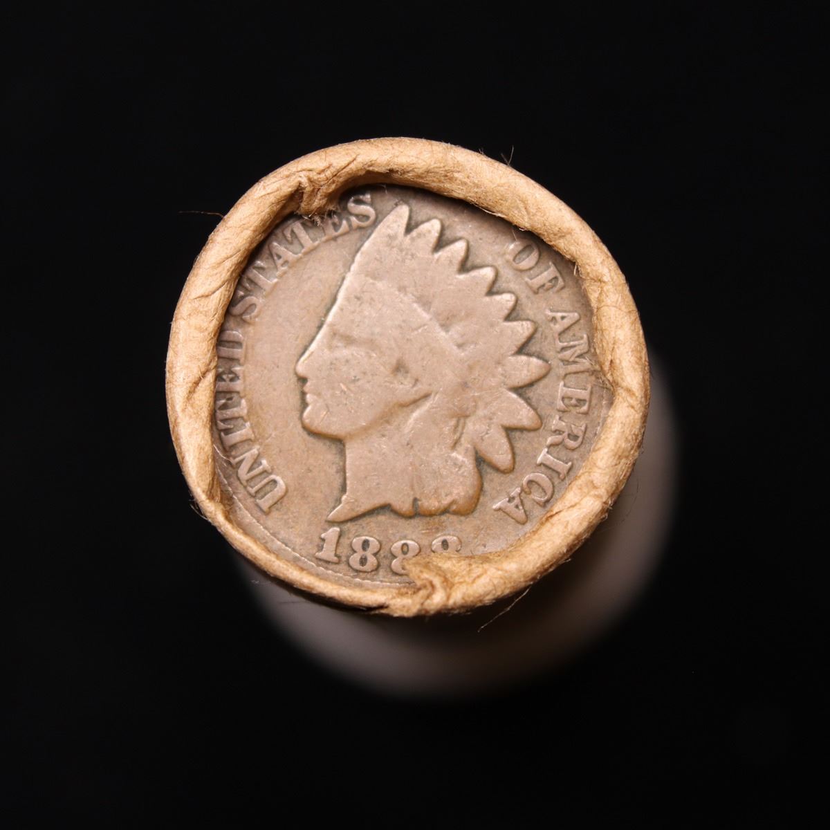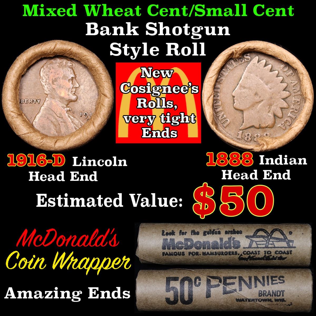 Mixed small cents 1c orig shotgun roll, 1916-d Wheat Cent, 1888 Indian Cent other end. The roll is held in an old Rare & Collectable McDonalds Brandt wrapper. Actual roll pictured is the roll you will get. A great original bank shotgun roll with very tight ends. We have opened a few of these rolls. They seem to be mixed small cents including Indians, Wheats, Steel cents & some Flying Eagles mixed in. These shotgun rolls are all from a new consignee. They are all frrom one Estate.