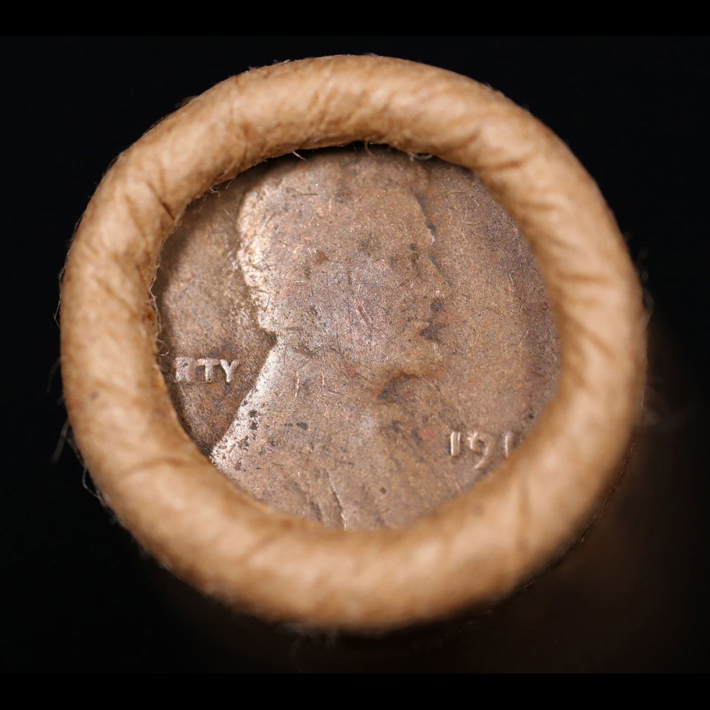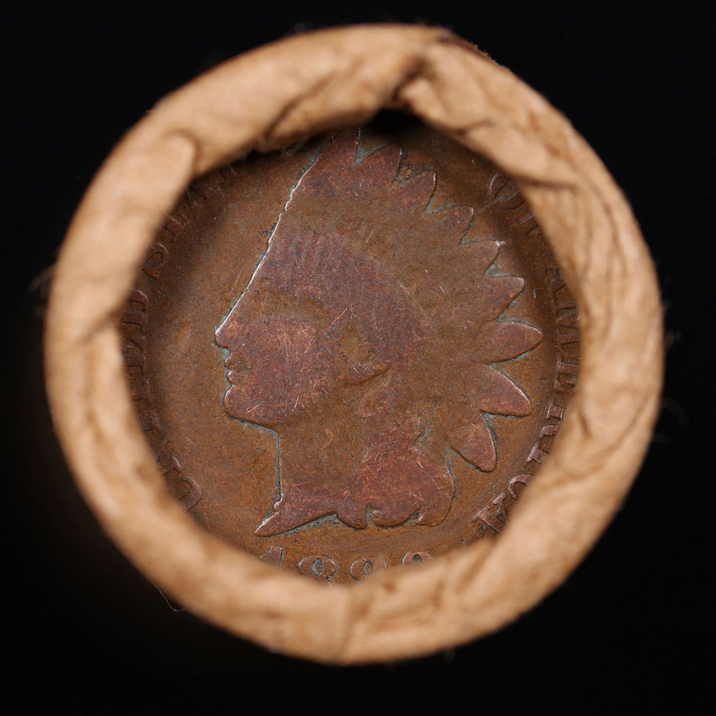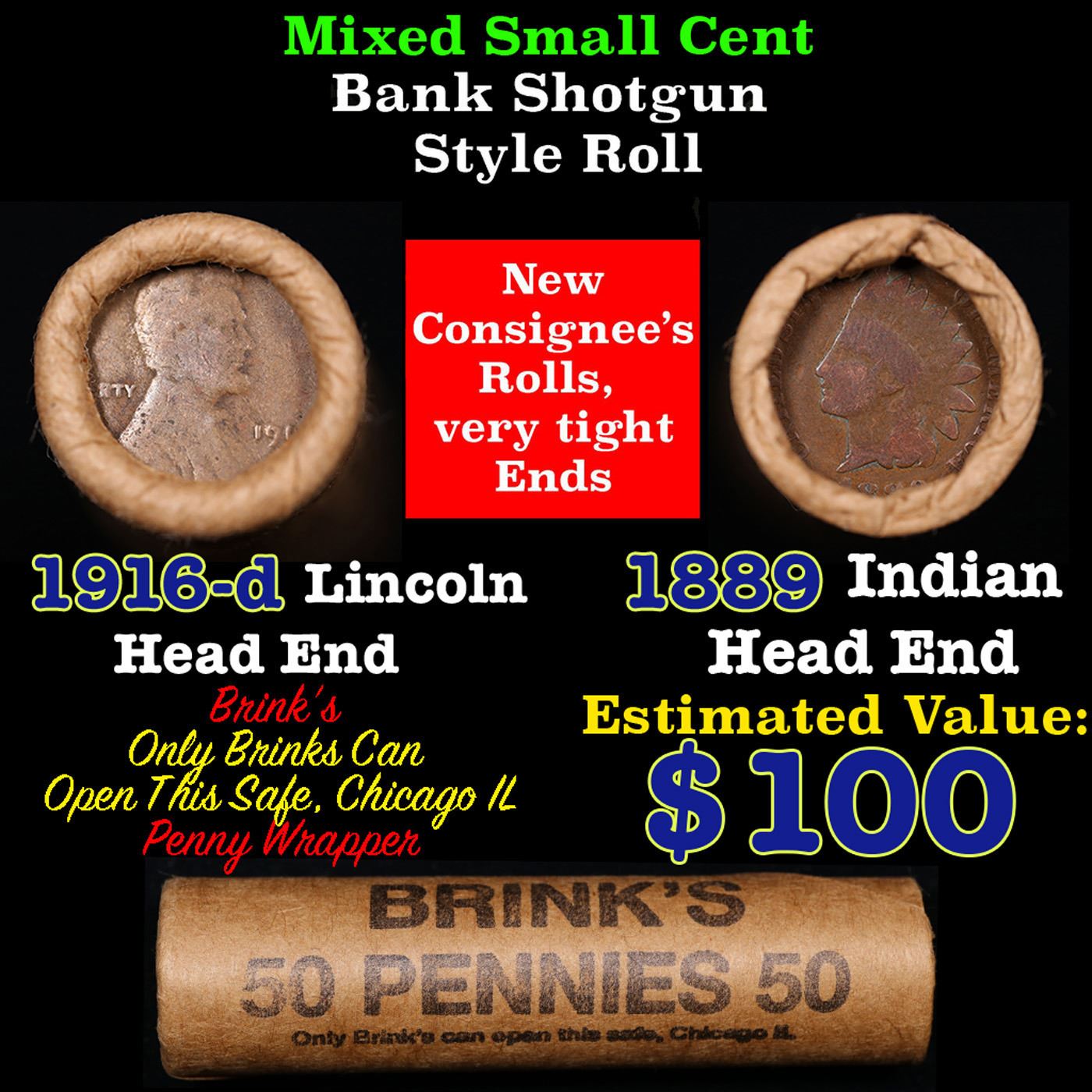Mixed small cents 1c orig shotgun roll, 1916-d Wheat Cent, 1889 Indian Cent other end, Brinks Wrappe