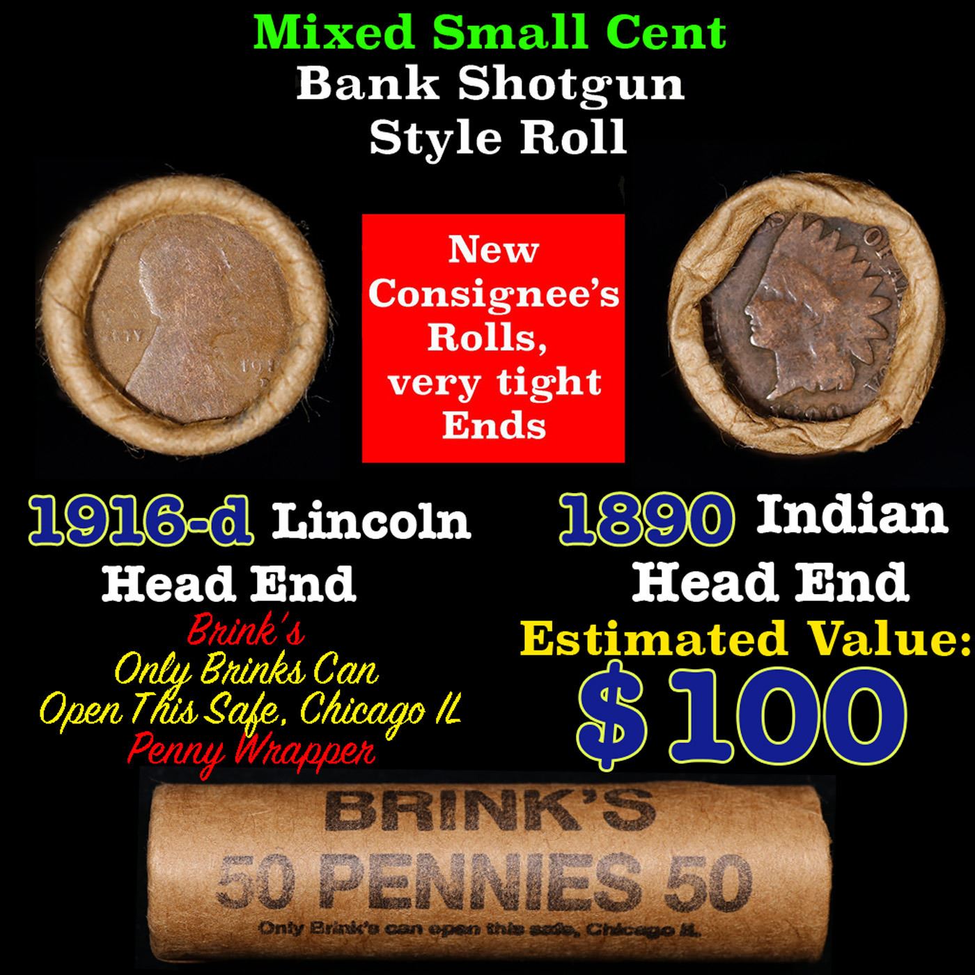 Mixed small cents 1c orig shotgun roll, 1916-d Wheat Cent, 1890 Indian Cent other end, Brandt Wrapper. The roll is held in an old Rare & Collectable Brandt Wrapper. Actual roll pictured is the roll you will get. A great original bank shotgun roll with very tight ends. We have opened a few of these rolls. They seem to be mixed small cents including Indians, Wheats, Steel cents & some Flying Eagles mixed in. These shotgun rolls are all from a new consignee. They are all frrom one Estate.