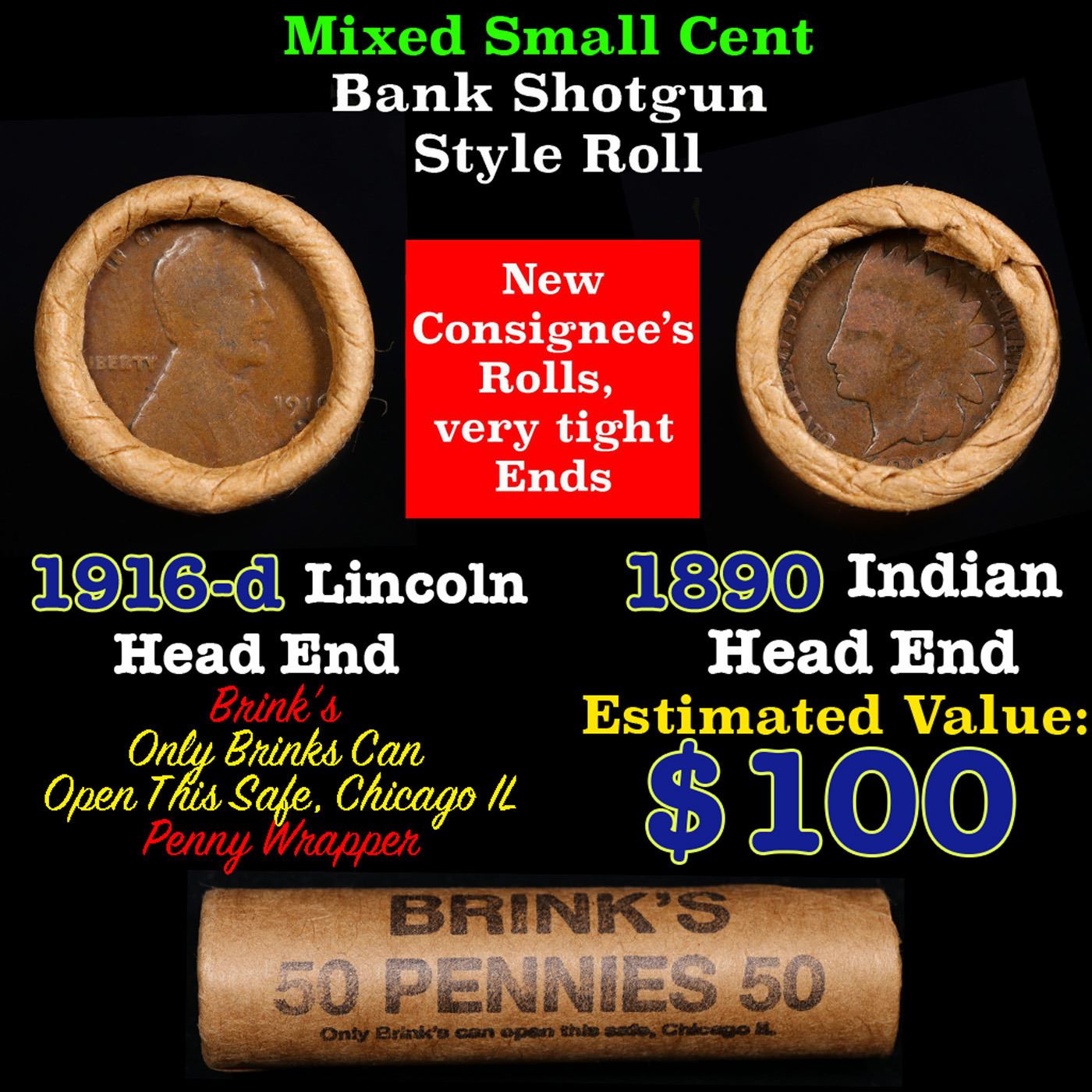 Mixed small cents 1c orig shotgun roll, 1916-d Wheat Cent, 1890 Indian Cent other end, Brinks Wrapper.. The roll is held in an old Rare & Collectable Brinks 'Only Brinks Can Open This Safe, Chicago IL' Penny wrapper. Actual roll pictured is the roll you will get. A great original bank shotgun roll with very tight ends. We have opened a few of these rolls. They seem to be mixed small cents including Indians, Wheats, Steel cents & some Flying Eagles mixed in. These shotgun rolls are all from a new consignee. They are all frrom one Estate.